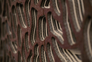 Das Paneel ist insgesamt durch die unterschiedlich geformten und tiefen Hohlräume akustisch wirksam, was die Absorbtion tiefer Schallwellen betrifft. Die Welle der Pappe und der Loden – auf den sonst schallreflektierenden Oberflächen, absorbieren Schall im mittleren und hohen Frequenzbereich. Durch die Versatzschichtung haben die Akustikpaneele eine graphische Erscheinung. Die Wandpaneelkomposition verändert sich aufgrund dessen optisch und sieht je nachdem, aus welchem Winkel sie betrachtet wird, anders aus. Die Farbtonwahl – außen dunkel und innen hell, ist ebenfalls inspiriert durch das natpürliche Vorbild – der Morchel.