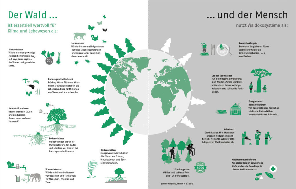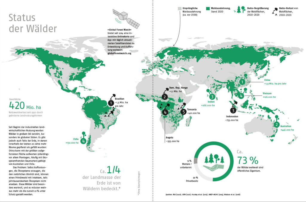 Recherchieren Sie zu relevanten Statistiken und stellen Sie uns das Thema „Wald” in ca. 20 wichtigen Zahlen bzw. in zueinander in Relation gesetzten Zahlenangaben vor … begleiten Sie dies durch gefundene oder selbst erstellte Visualisierungen. Themen können hier vielfältig sein: Waldvorkommen, Baumarten, Wald und Ökonomie, Besitzverhältnisse, Veränderungen (Abholzung, Aufforstung etc.), Veränderungen durch klimatische Einflüsse, Gefahren für den Wald etc.