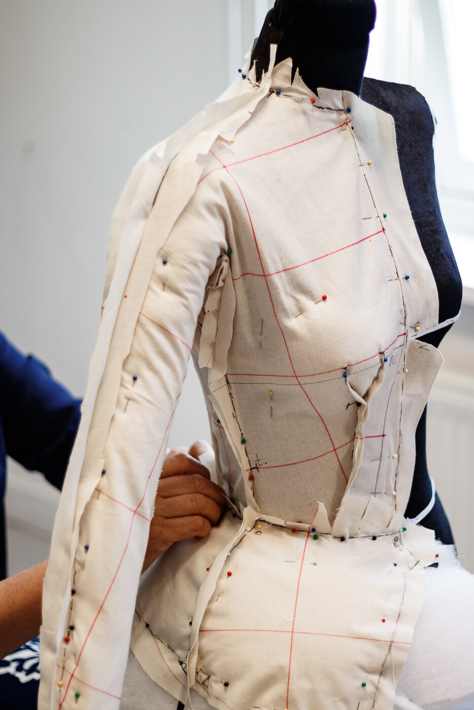 In diesem Workshop werden die Grundtechniken der Moulage vermittelt – einer Couture-Technik, bei der direkt mit Stoff an der Schneiderpuppe gearbeitet wird. Dies ermöglicht eine schnellere Entwicklung von Schnitten, da Proportionen, Linienführungen sowie Rock- und Ärmellängen sofort sichtbar sind und direkt ins Design einfließen. Themen sind das Vorbereiten der Schneiderpuppe, verschiedene Rockschnitte, Grundschnitte für Oberteile, die Herstellung eines Moulage-Arms und diverse Ärmelformen. Die Woche endet mit einer freien Aufgabe, bei der der Fokus auf das drapieren einer Silhouette mit gezieltem Volumen liegt.