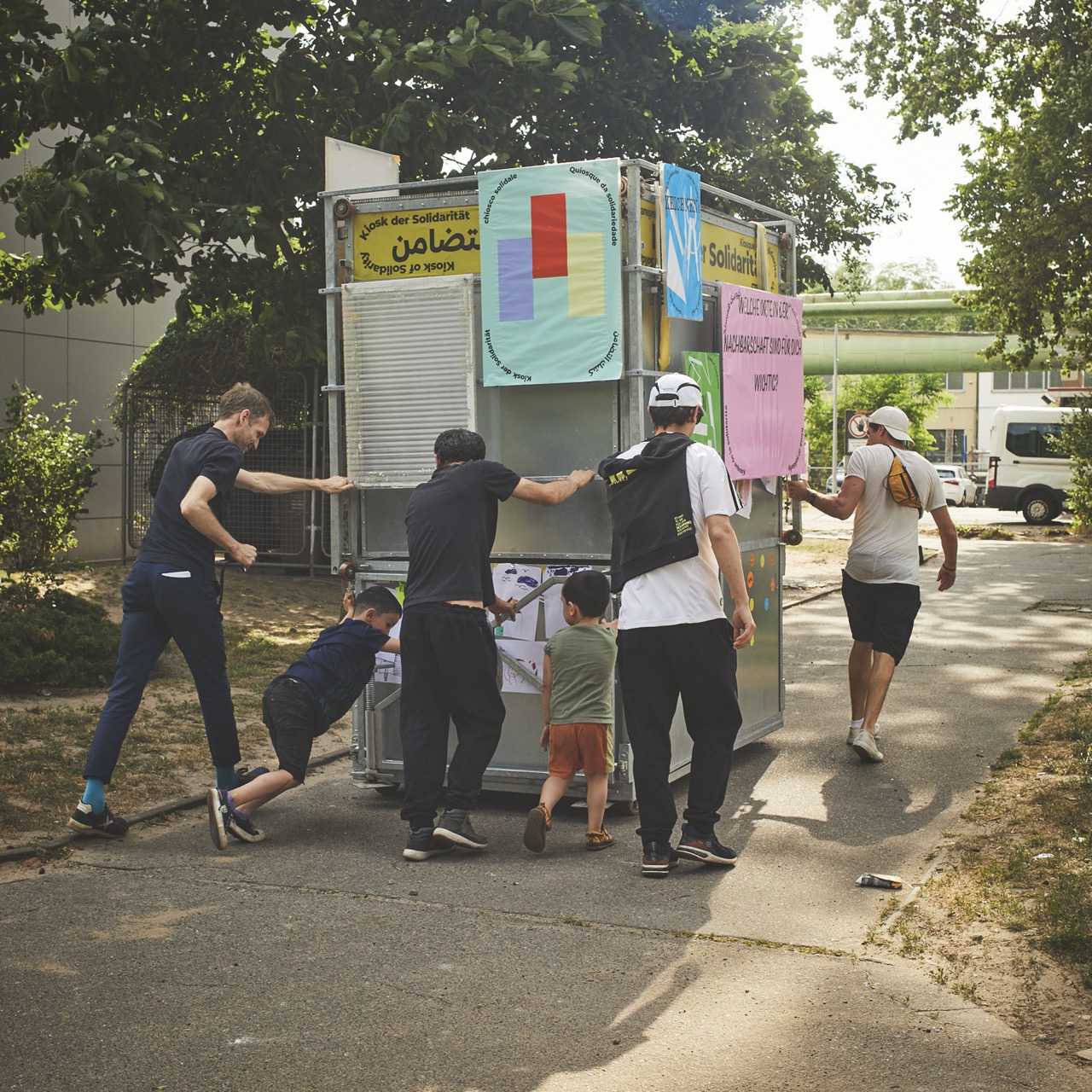 Im Wintersemester 2022/23 arbeitete noch vor der Ausstellung eine Gruppe aus den gestalterischen Grundlagen8 im Format „Gemeinsam Gestalten“ der Studiengruppe Informationsdesign (SI) mit uns zu den Fragestellungen in der AWO und den [SDS]. Im Mai 2024 wurde mit dem Kiosk of Solidarity eine Folgeumfrage zu Gestaltungsansätzen zu den umgebenden Grünflächen durchgeführt und Ideen gesammelt. Für den Sommer 2025 sind prototypische Interventionen weiterer Ansätze geplant.