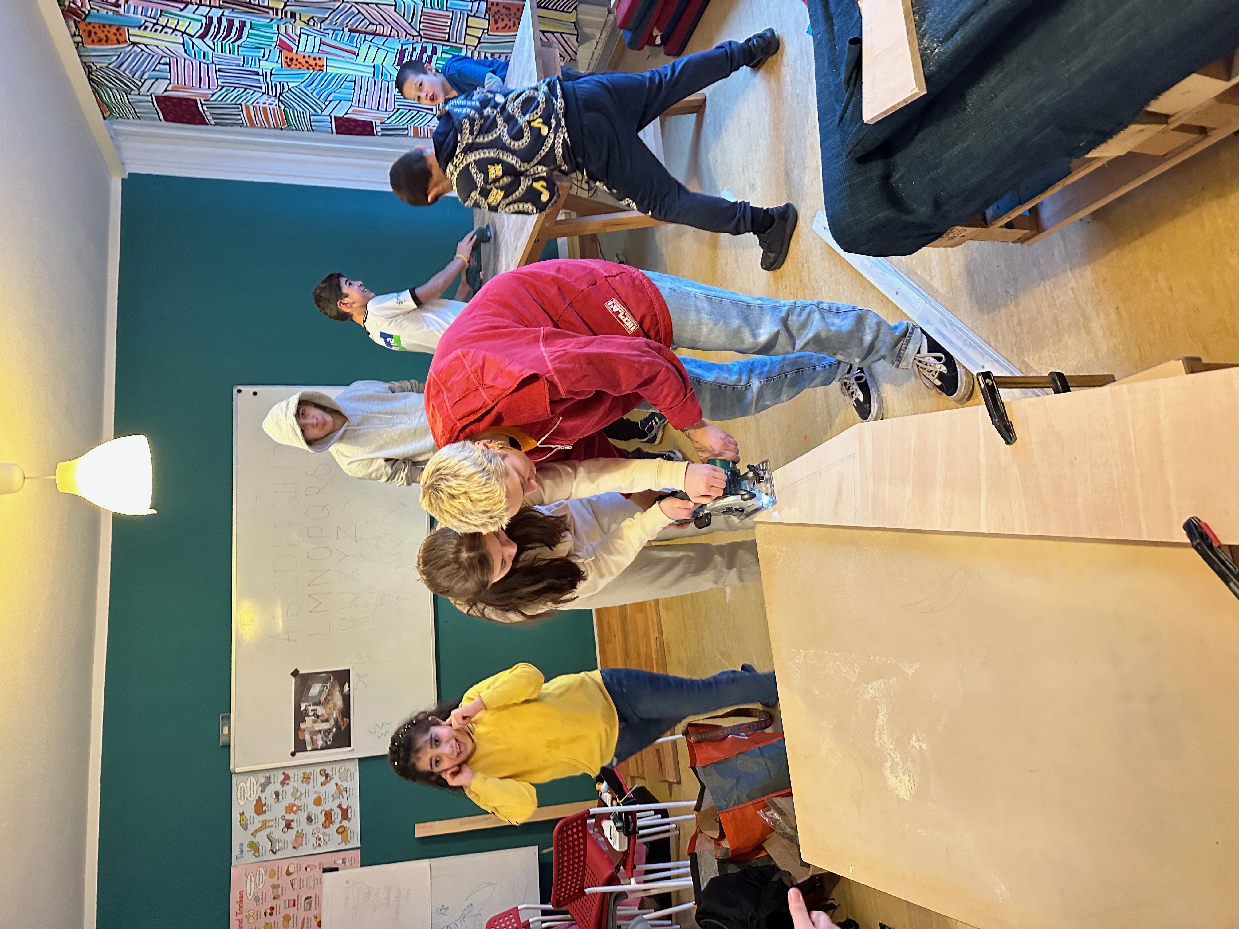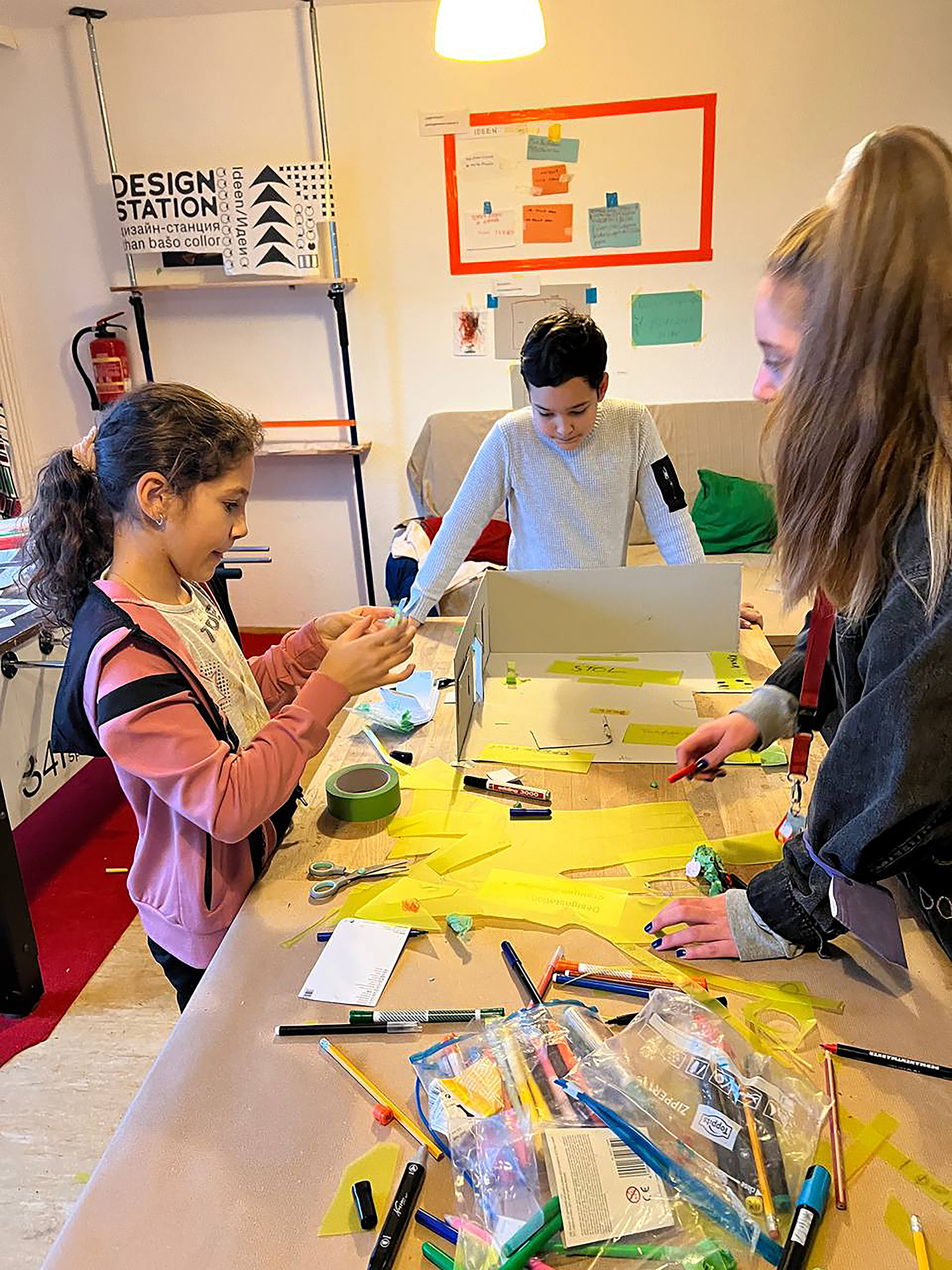 Zum ersten Termin suchten und benannten wir gemeinsam eine Nische oder einen Bereich in den Räumen und strukturierten sie als Designstudio. Hier konnten Ideen gesammelt und entwickelt werden. In verschiedenen Sprachen druckten und klebten wir diese aus, entwarfen Zeichnungen und Modelle, machten Listen, bestellten Material und setzten Veränderungen um. Die meisten davon blieben bis zuletzt Zwischenlösungen und Prototypen.