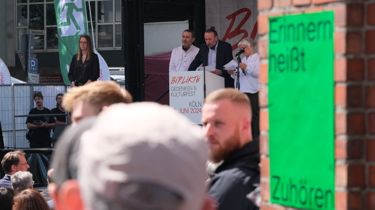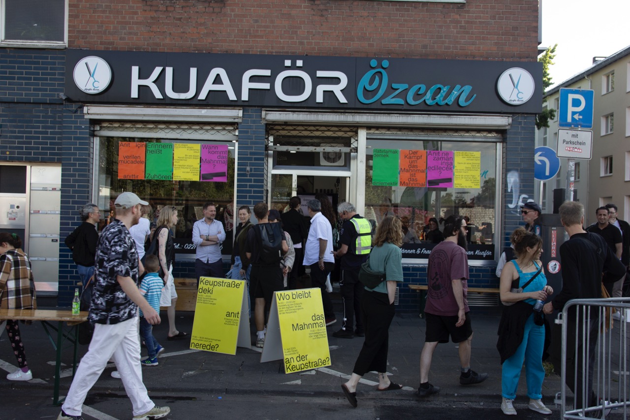 Die Plakate wurden von uns in einer Nachtaktion im öffentlichen Raum angebracht – entlang der Keupstraße, am Schaufenster des Friseursalons und an zentralen Sichtachsen. Zwei Plakate platzierten wir bewusst direkt neben der Hauptbühne, auf der am Folgetag Politiker*innen wie die Kölner Oberbürgermeisterin Henriette Reker, Ministerpräsident von Nordrhein-Westfalen Hendrik Wüst und Bundespräsident Frank-Walter Steinmeier sprachen. Genau dort, am zentralen Ort des Erinnerns an die Opfer rechter Gewalt, hatte die Investor*innengruppe gentes, ohne Absprache mit den Betroffeneninitativen ein großes Banner angebracht, das ihre Bebauungspläne für das Gelände an der Keupstraße präsentierte. Das geplante Mahnmal – auf dem Banner kaum sichtbar, aber dennoch bewusst platziert – verdeutlichte die Machtasymmetrie zwischen kommerziellen Interessen und dem Erinnerungsbedürfnis der Betroffenen. Wir entschieden uns deshalb, die Plakate dort zu platzieren und somit diese Vereinnahmung des Gedenkens durch das Werbebanner, mit den Stimmen der betroffenen Personen zu kommentieren und deutlich zu kritisieren.