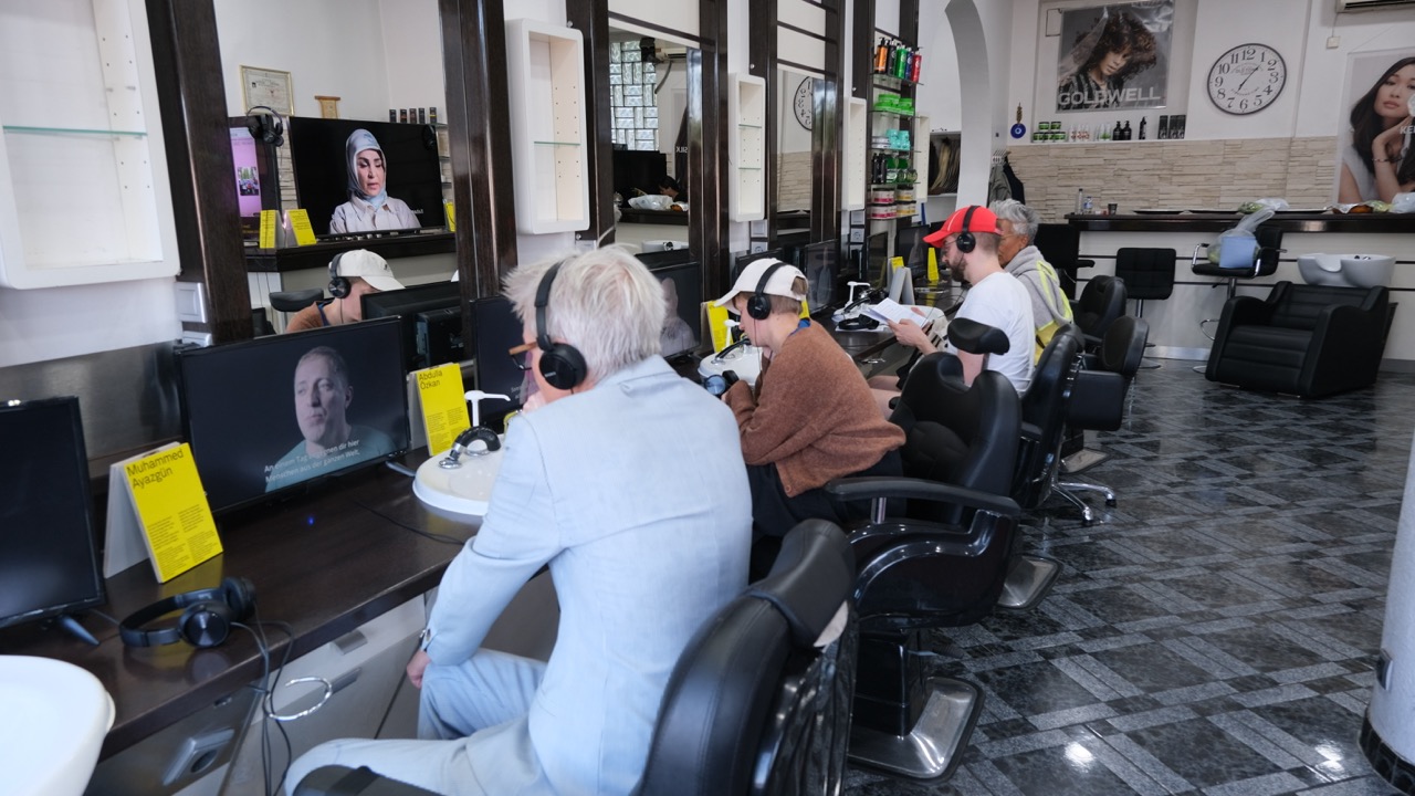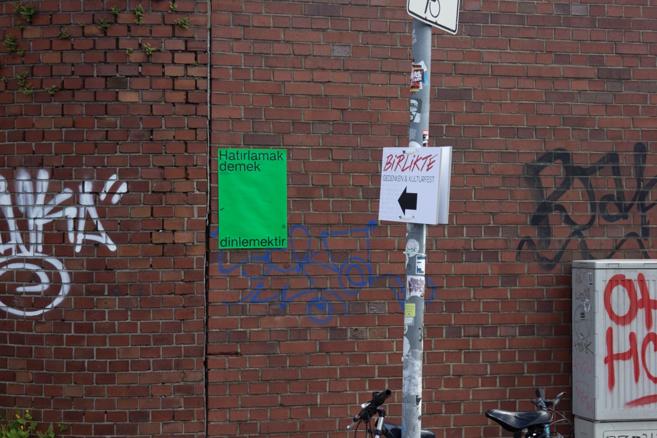 Zum 20. Jahrestag des Anschlags am 9. Juni 2024 präsentierten wir unsere Entwürfe im Friseursalon Özcan auf der Keupstraße in Köln – der neue Laden der Yıldırım Brüder, bei denen die Bombe damals explodierte – im Rahmen des Gedenkfestes Birlikte. Parallel dazu entwickelten wir eine mehrsprachige Plakatkampagne, mit der wir die Forderungen der Betroffenen sichtbar im Stadtraum positionierten. Die Plakatserie, gestaltet auf Deutsch und Türkisch, bildet die zentralen Forderungen der betroffenen Personen, der Initiative und des Künstlers ab: „Erinnern heißt Zuhören“, „Der Kampf um das Mahnmal ist das Mahnmal“ und „Wo bleibt das Mahnmal?“. Die typografisch-kompositorische Gestaltung der Plakate unterstreicht dabei jeweils die inhaltliche Forderung: Viel Raum für das Zuhören, Zentrierung und Stabilität für den aktivistischen Kampf und eine Markierung der Lücke für das immer noch fehlende Mahnmal.