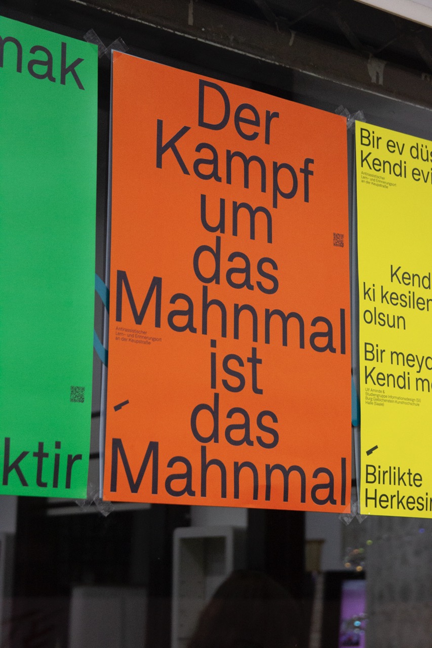 Wenn Design gesellschaftlich wirksam sein will, muss es nicht nur marginalisierte Perspektiven einbinden, sondern zum einen die strukturellen Bedingungen hinterfragen, die diese Marginalisierung erst hervorbringen und zum anderen auch seine eigene Rolle befragen – denn es entstammt ganz ähnlichen strukturellen Bedingungen. Unsere Mitarbeit an der visuellen Sprache des Erinnerungsortes und die Konzeption der Plakatserie, die sich den lokalen Forderungen anschließt, sind ein Versuch in diese Richtung: Intervention als bewusste, politische Gestaltungspraxis.