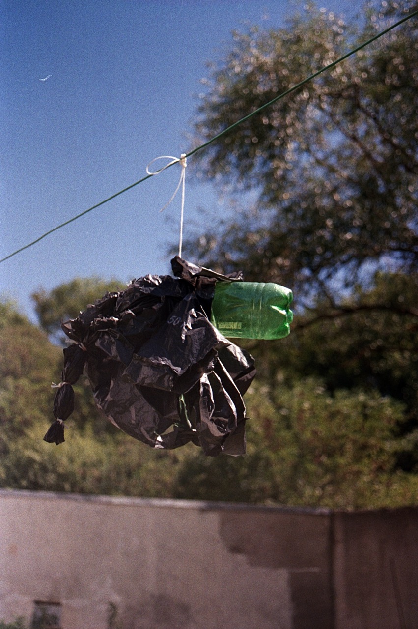 Using everyday objects — a plastic bottle, a black bag, a forgotten kite, an old T-shirt, and even my old toy helmet — he transformed dusty objects into rustling, wind-blown figures.