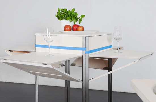 Entstanden sind Küchensolitäre, die sich von herkömmlichen Raumbindungen und Strukturen lösen und in bewusstem Kontrast zu den tradierten Bildern von Einbauküchen stehen. Gestaltet wurden „Arbeitsplätze” und deren Organisation für eine der schönsten Alltagsbeschäftigungen: Kochen.
