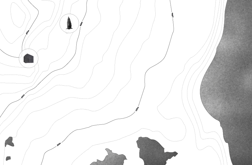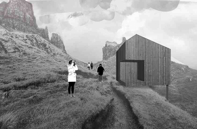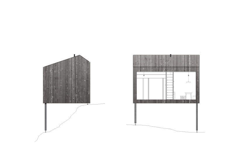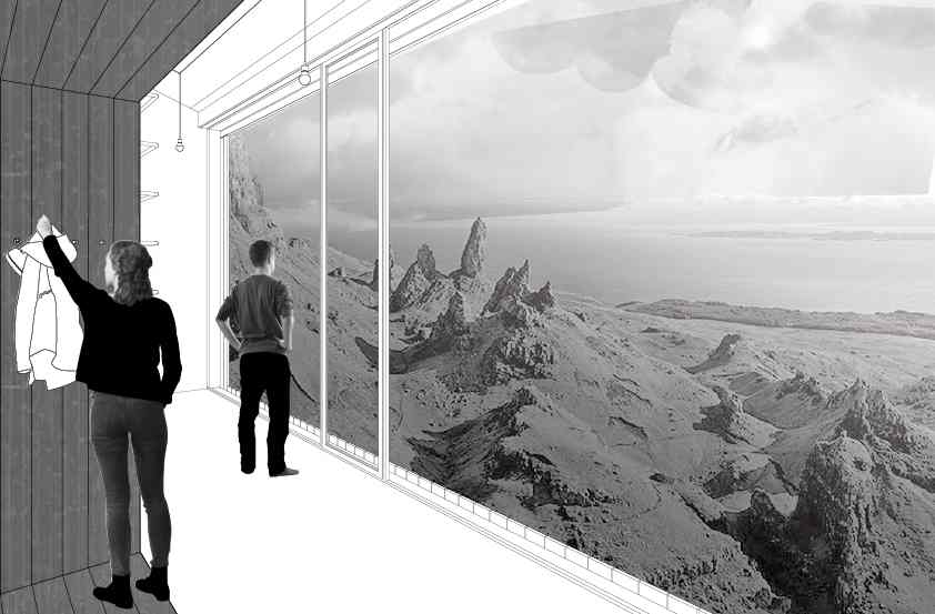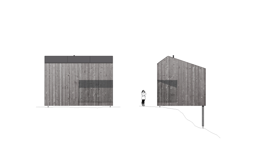 Der Entwurf des Gebäudes tritt nicht in Konkurrenz dazu, sondern ist als Beobachter aus sicherer Entfernung konzipiert. Mit seiner klaren Form und der schlichten, dunklen Außenhülle bindet sich der Baukörper wie selbstverständlich in die Umgebung ein und ist erst auf den zweiten Blick erkennbar.