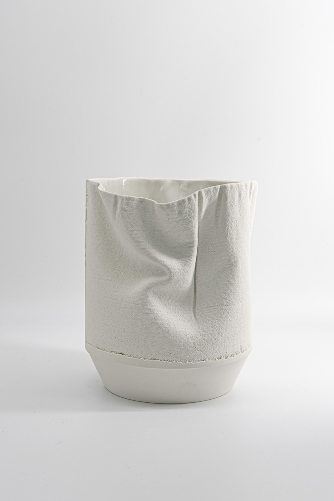 This project is a material experiment with porcelain and textiles, an attempt to use materials in mold construction, structure and surface design. I wanted to impart lightness to porcelain, confuse the viewer and especially transfer the organic, individual appearance of textile to the porcelain body. By carefully observing time, humidity and temperature I managed to reproduce objects with the same plaster mold and the same textile inlay. The result is vessels of the same shape, the same geometry and the same surface which are nonetheless unique due to the varying drapery.