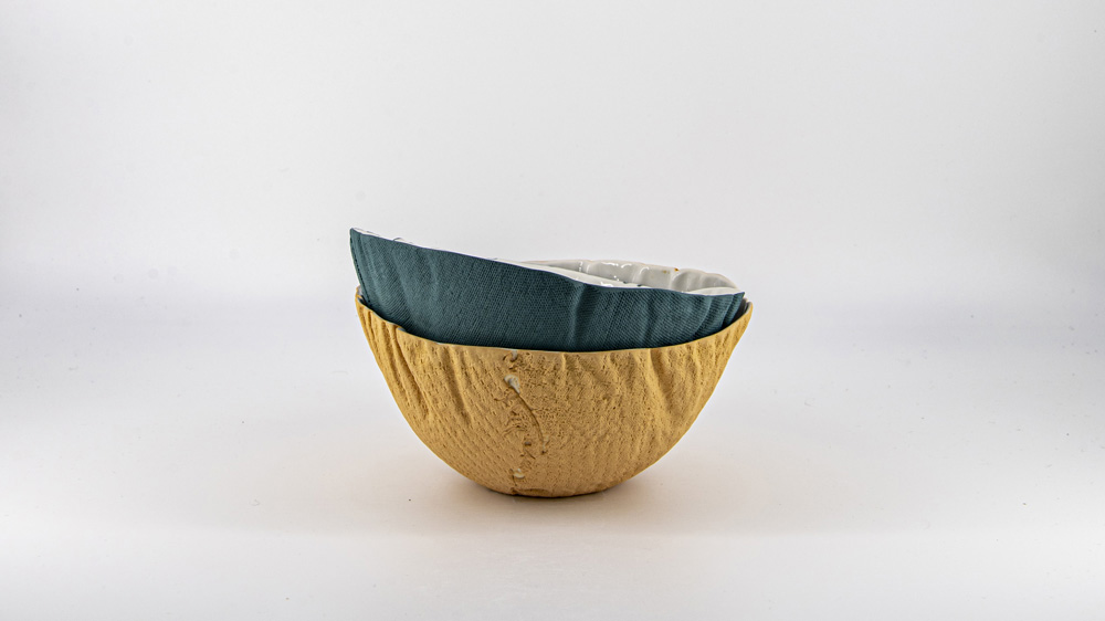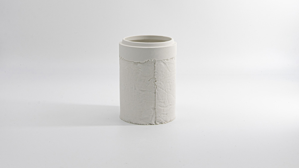 Dieses Projekt ist ein Materialexperiment mit Porzellan und Textil und baut auf einer Versuchsreihe von 120 kleinen Zylindern, in denen ich unterschiedliche Stoffe eingegossen und dann im Ofen verbrannt habe, auf. Die textilen Oberflächen und Strukturen übertrugen sich so auf den Scherben. Die dabei gesammelten Erkenntnisse konnte ich als Ausgangslage nutzen und jetzt in meinem BA Projekt daran anknüpfen. Mein Ziel war es, meine Ansätze und Ergebnisse, die ich während meines Studiums mit dieser von mir entwickelten Technik gemacht habe, zu verfeinern und für mich relevante Anwendungsmöglichkeiten zu entdecken.