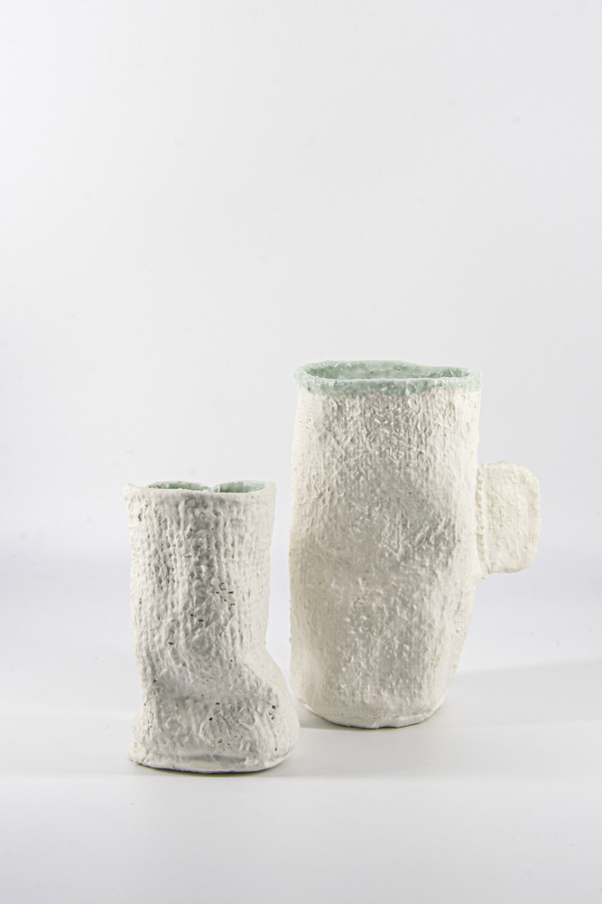Im Laufe des Prozesses gelang mir durch genaue Beobachtung von Feuchtigkeit, Zeit und Temperaturen Objekte mit den gleichen Gipsformen und Textileinlagen zu reproduzieren. So entstanden Gefäße aus derselben Form, mit derselben Geometrie und derselben Oberfläche, die durch den variierenden Faltenwurf trotzdem Unikate sind.