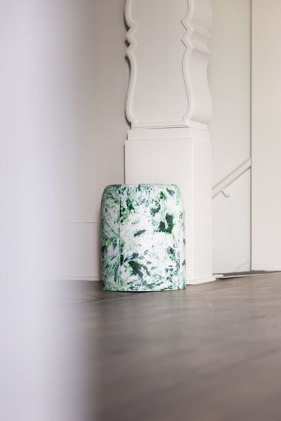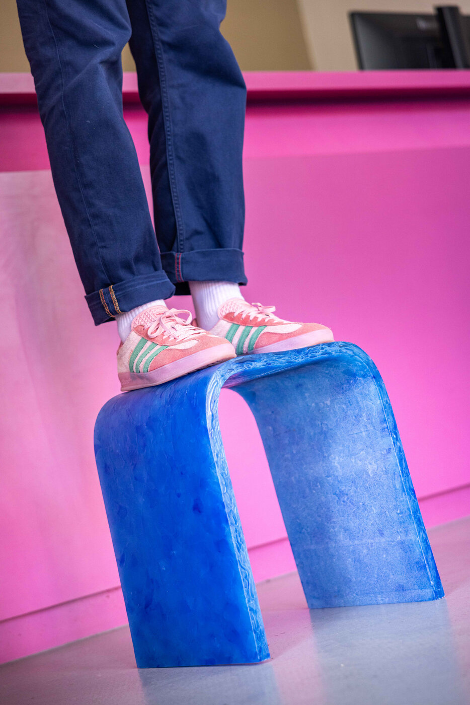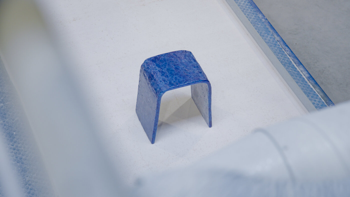 Entstanden sind drei Hocker aus drei recycelten Materialien: Kunststoff, Leder und Glas. Die Arbeit positioniert sich an der Schnittstelle von Entwurf, Storytelling und digitaler Öffentlichkeit. Sie versteht Gestaltung nicht nur als materielle Form, sondern als kommunikativen Akt und fragt, wie sich die Rolle von Designer*innen verändert, wenn ihre Arbeit zunehmend über Sichtbarkeit, mediale Präsenz und digitale Relevanz verhandelt wird.
