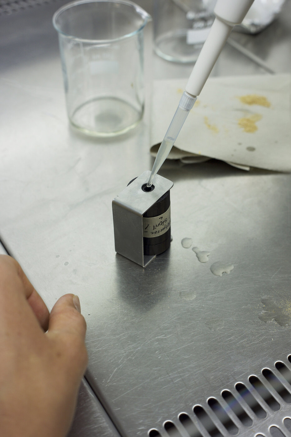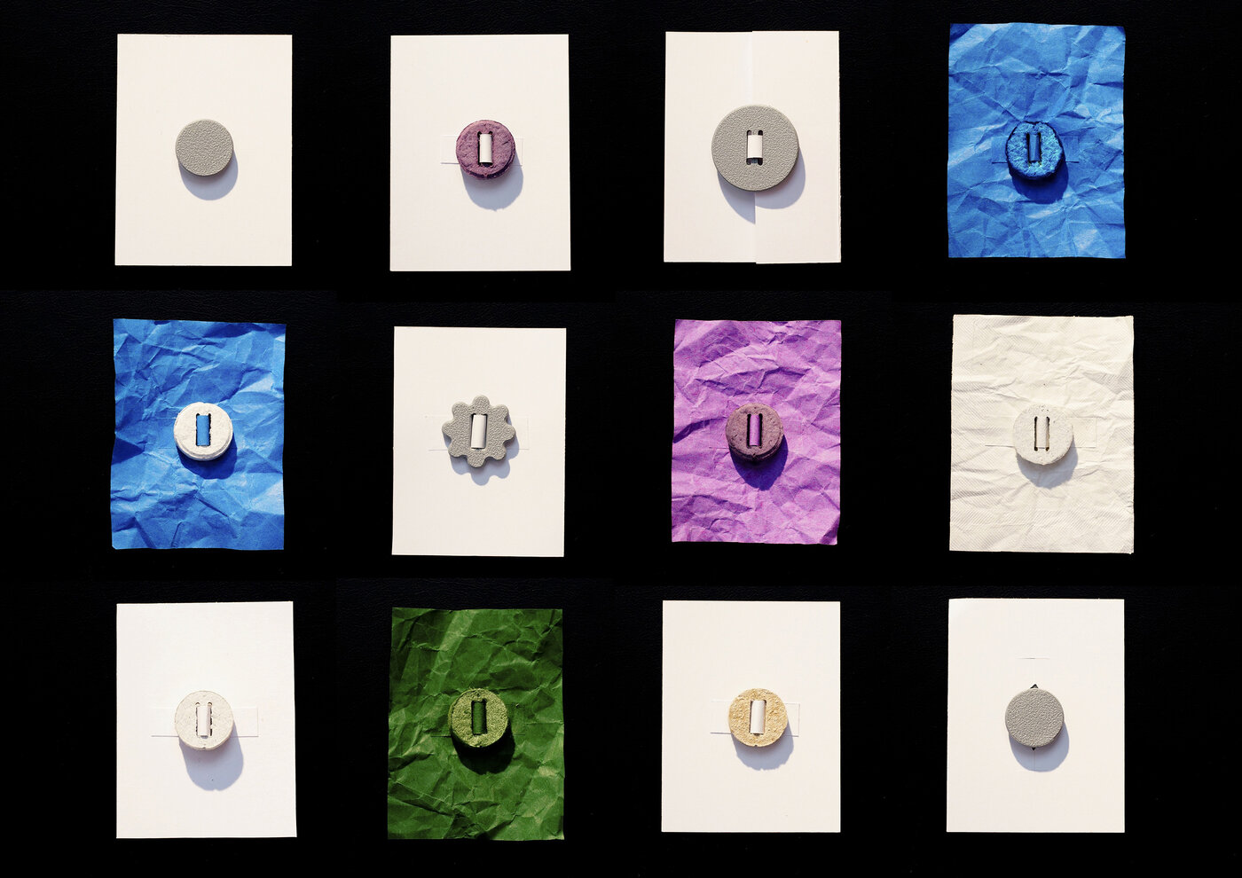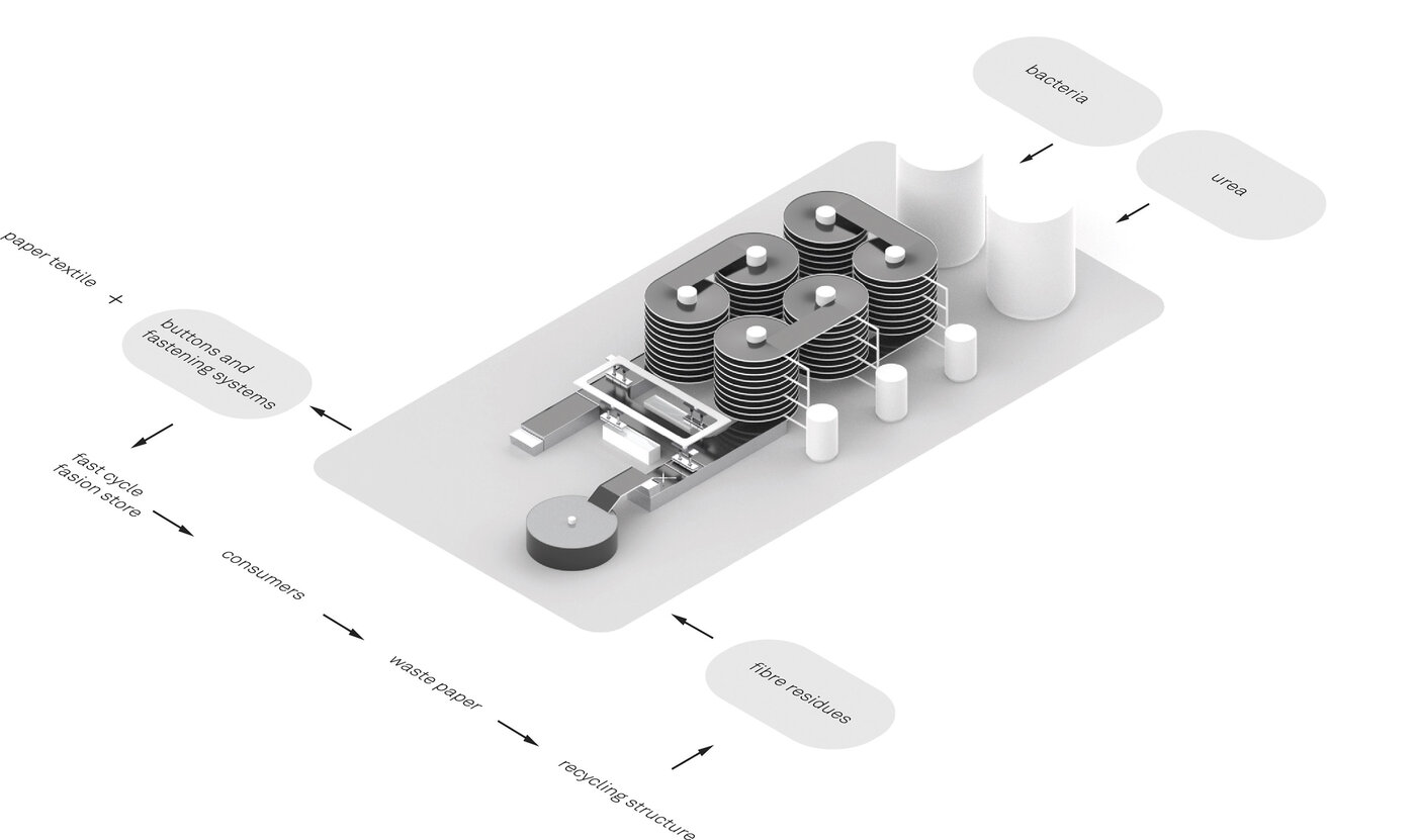 Als Material werden Papierfasern verwendet, die zu kurz sind, um erneut zu Papiertextilien recycelt zu werden. Diese fallen bei der Herstellung von Papier in einem Faserschlamm an. Aus einem Gespräch mit den Verantwortlichen der Papierrecycling GmbH & Co. KG Julius Schulte Trebsen erfuhren wir, dass allein in diesem Betrieb jährlich 2.000 Tonnen an Faserschlamm entstehen. Nach dessen Entwässerung und Reinigung gehen wir von ca. 500 Tonnen Material aus, welches für unsere Zwecke weiterverwendet werden kann. Dieses wird püriert, um gleichmäßiger in Pressformen gefüllt zu werden. Die Formen laufen für zwei Tage auf einem 2 km langen (in sechs Helixen aufgeteilten) Fließband und werden in dieser Zeit in einem Abstand von vier Stunden abwechselnd mit einer Bakterienlösung aus Sporosarcina pasteurii und einer Urea enthaltenden Aktivierungslösung beimpft. Der somit initiierte Prozess der Biomineralisierung lässt die Knöpfe stabil und wasserabweisend werden. Ausgehend von diesen Ausmaßen ließen sich täglich 500.000 Knöpfe produzieren.