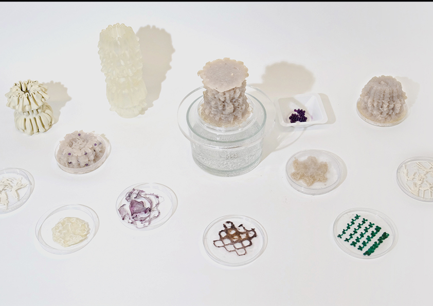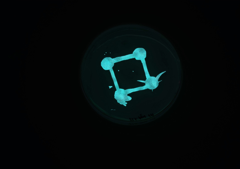 Im Labor werden Bakterien häufig auf Agar Platten kultiviert. Wir haben in einem Experiment die ausgestanzten Teile der Agarplatte mit LBS-Nährmedium ausgetauscht und darauf die Bakterien verteilt, um zu prüfen wo die Bakterien am ehesten wachsen. Diese Methodik haben wir auf unsere 3D Masse übertragen und sie sollte uns zeigen, dass wir das Wachstum der Bakterien an bestimmten Stellen in unserer Struktur beschleunigen und die Konzentration der Bakterien erhöhen können. Vor dem einbetten der Bakterien, werden sie meisten vermehrt, dann pelletiert. Sie werden sozusagen konzentriert aus dem Nährmedium entnommen und dann in die Masse eingebettet. Für das weiterleben und stetige Wachstum ist nicht nur das Material wichtig, sondern auch die Umgebung. Wie wir bereits wissen, ist es wichtig die Bakterien in einem Sauerstoffreichen und feuchten Habitat zu halten. Wasserstoffperoxid könnte von unten als sogenannten Oxidator dienen, der die Luft mit Sauerstoff und Wasserdampf versorgt. Wie in einem Aquarium. Auf der Schale liegt ein perforierter Teller, auf dem die Biomasse steht und den Dampf durchlässt. Das Ganze wird durch eine Glasglocke steril und geschützt gehalten. Der 3D Druck gibt uns die Freiheit Strukturen zu gestalten, um die Bakterien so zu beobachten wie sie sich sonst nur im tiefsten Ozean verhalten. Unsere Faszination dieser leuchtenden Kreaturen wird beflügelt und wir sehen sie ganz nah und glasklar.