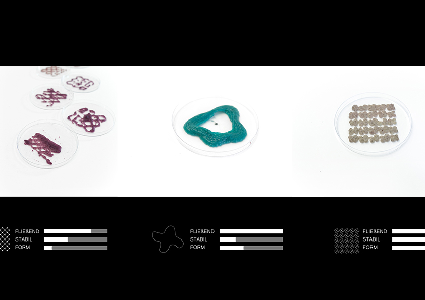 Was wäre, wenn man Bakterien auf einer ganz anderen Art und Weise - ganz nah und zugänglich beobachten könnte? Könnte eine dreidimensional gedruckte Struktur als Schaufenster für die Beobachtung der Bakterien dienen? Wie Ameisen hinter Glas könnten wir sehen wie Bakterien in ihrem optimalen Habitat weiterleben und wachsen. Würden sie uns etwas über ihre Umgebung signalisieren? Könnten wir von ihrem Verhalten lernen? In diesem Semesterprojekt, haben wir uns auf die Reise begeben Materialien in unterschiedlichster Zusammensetzung zu untersuchen, ihre Druckfähigkeit zu überprüfen und sie schlussendlich als ein Zuhause bestimmter Mikroorganismen anzubieten. A. fischerii kommt in allen Weltmeeren vor, jedoch besonders verbreitet in Symbiose mit anderen Meereslebewesen. Nur wenn sich genügend Bakterien in der nächsten Umgebung befinden, fangen sie gemeinsam an zu leuchten. Die Fähigkeit zu Leuchten ist abhängig vom Vorhandensein von Sauerstoff. Ein Enzym, die sogenannte Luciferase, wandelt erst dann den Sauerstoff in Wasser und Licht um. Diese Bedingungen wollen wir in unserer Struktur und in unserem Material erfüllen. Der 3D Druck gibt uns die gestalterische Freiheit Strukturen zu bauen, die eine Observierung der Bakterien ermöglichen. Wir können die Bakterien ebenfalls punktuell einbetten und das Wachstum an bestimmten Stellen maximieren. Hierfür mischen wir unsere Druckmasse aus festem und flüssigem Material an, um eine ideale Konsistenz zu generieren, die gleichmäßig extrudiert wird, ohne ihre Form zu verlieren. Unsere Experimentierreihe ist darauf ausgelegt ein Material zu finden, das die Anforderungen der Bakterien erfüllt und gleichzeitig druckbar ist. Das heißt feucht, transparent und formbar. Dabei ist eine gelartige Konsistenz entstanden aus Flohsamenschalen, Alginat und Agar.