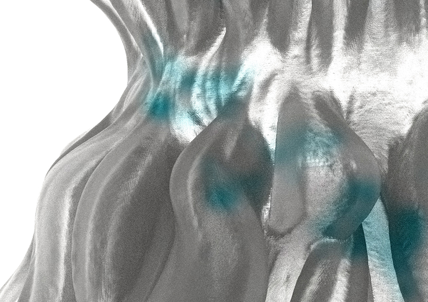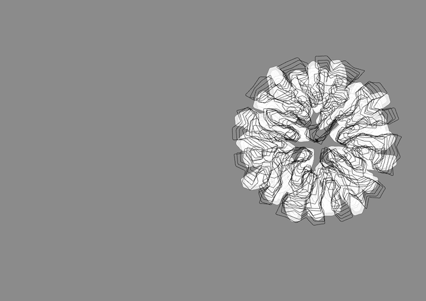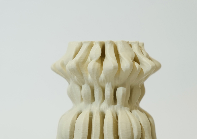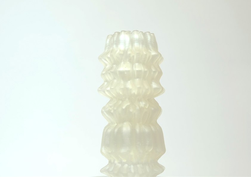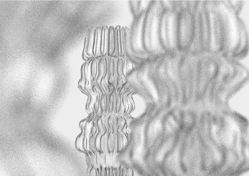 Die Druckversuche haben ergeben, dass je höher die Masse gedruckt wird, desto schneller fällt sie in sich zusammen. Um diese Fehler zu umgehen, haben wir festgestellt, dass kleinere Kurvenradien innerhalb der Struktur eine Masse schafft, die sich selbst stützen kann. Unregelmäßigkeiten werden ebenfalls eher verziehen bei einer kurvenreich gedruckten und weichen Biomasse. Mit einem Algorithmus haben wir solche Kurven gebildet, die innerhalb der Struktur knapp aneinander vorbeilaufen. Somit schafft man einerseits eine stabile Form, die nicht in sich einfällt und gleichzeitig mehr Oberfläche für die Mikroorganismen bietet.