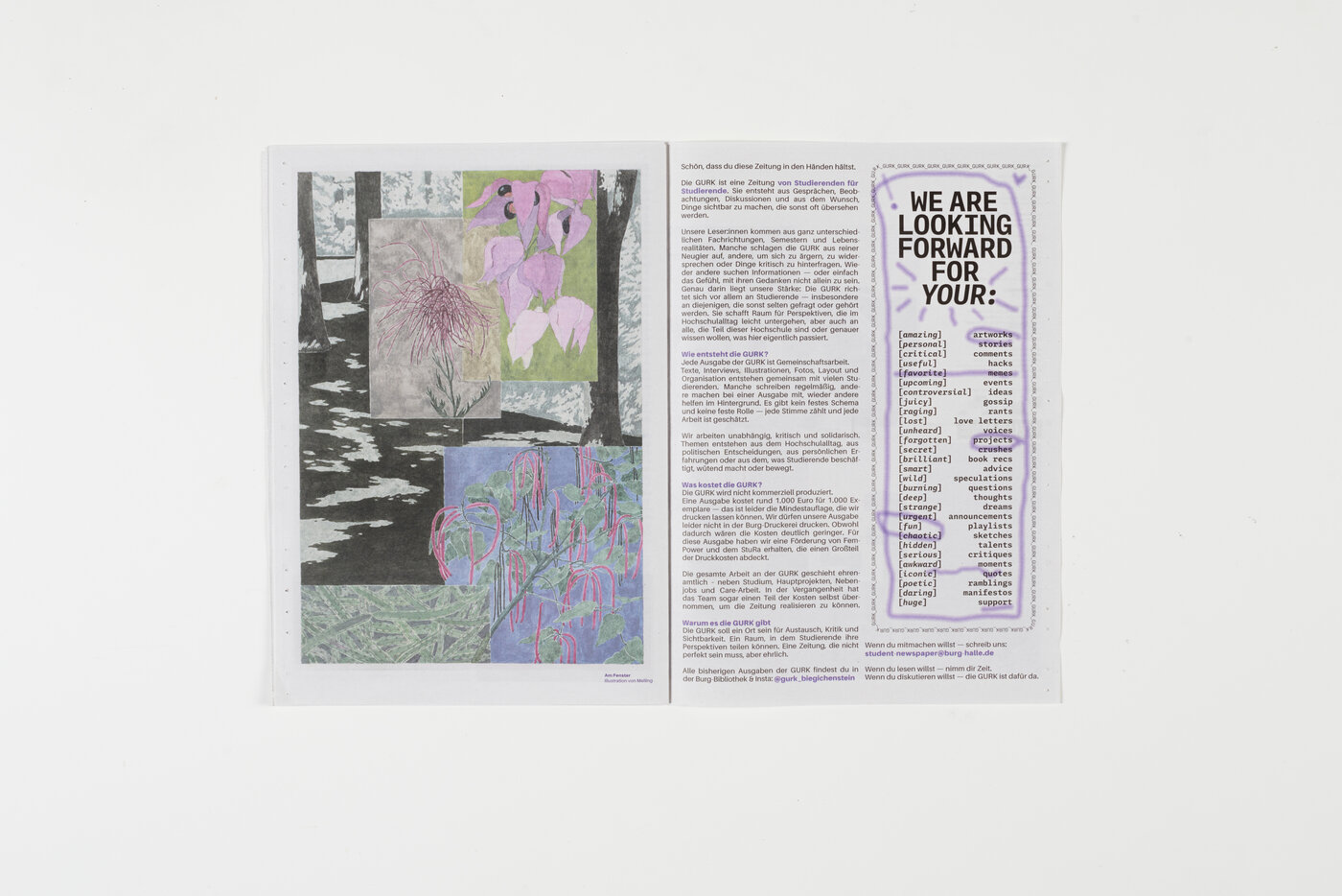 Alle bisherigen Ausgaben der GURK findest du in der Burg-Bibliothek & Insta: @gurk_biegichenstein / ed.ellah-grub@repapswen-tneduts