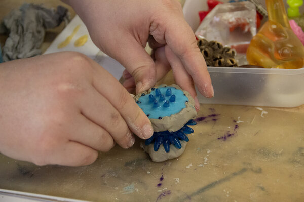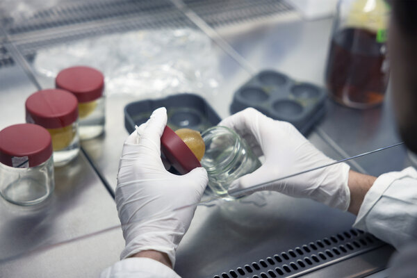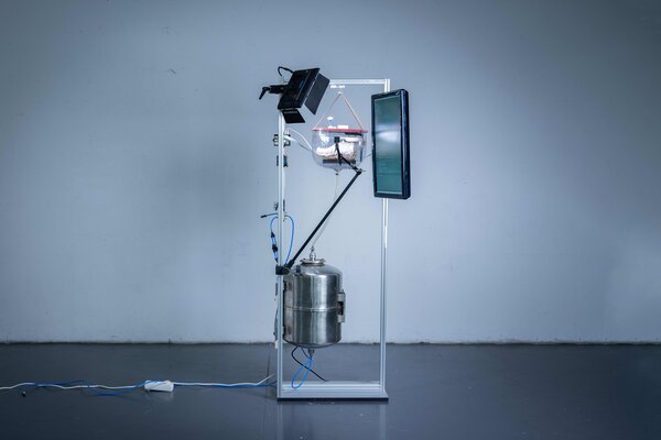 Im Kosmos der Mikroorganismen haben viele erstaunliche Eigenschaften. Hier haben wir uns auf ihre Wachstumsfähigkeit konzentriert. Wir wollten an diesem Prozess teilhaben, indem wir die Gestalt, Form oder sogar Eigenschaften dieser winzigen Lebewesen kontrollieren. Wir haben uns gefragt: Wie können wir Wachstum kreativ nutzen? Wie können Menschen und Organismen zusammenarbeiten, um neue Prozesse, Produkte oder Dienstleistungen zu schaffen? Und welche Rolle spielt der Organismus im Designprozess? Ist er ein Material, ein Designer oder etwas ganz anderes? Wir haben mit dem vom BioLab entwickelten Freeze-Slip-Gussverfahren experimentiert, um einen definierten Lebensraum und das Wachstum von Mikroorganismen zu schaffen. Um sich von der Zweidimensionalität der üblichen Petrischale im Labor zu befreien, ist es dem BioLab gelungen, ein Verfahren zu entwickeln, das das Potenzial hat, ideale Lebensräume für Mikroorganismen in drei Dimensionen zu schaffen. Das verwendete Material besteht hauptsächlich aus dem Hydrogel Alginat. Dieses wird in flüssigem Zustand in eine Negativform aus Silikon gegossen, tiefgefroren und anschließend in ein Bad aus Calciumchlorid getaucht. Das Alginat polymerisiert und behält auch nach dem Auftauen seine Form. Basierend auf dem Herstellungsverfahren des Schlickergusses hat das BioLab dieses Verfahren weiterentwickelt, um einen Lebensraum als Hohlkörper herzustellen. In dem Hohlraum können verschiedene Organismen gleichzeitig und vor allem formstabil wachsen.