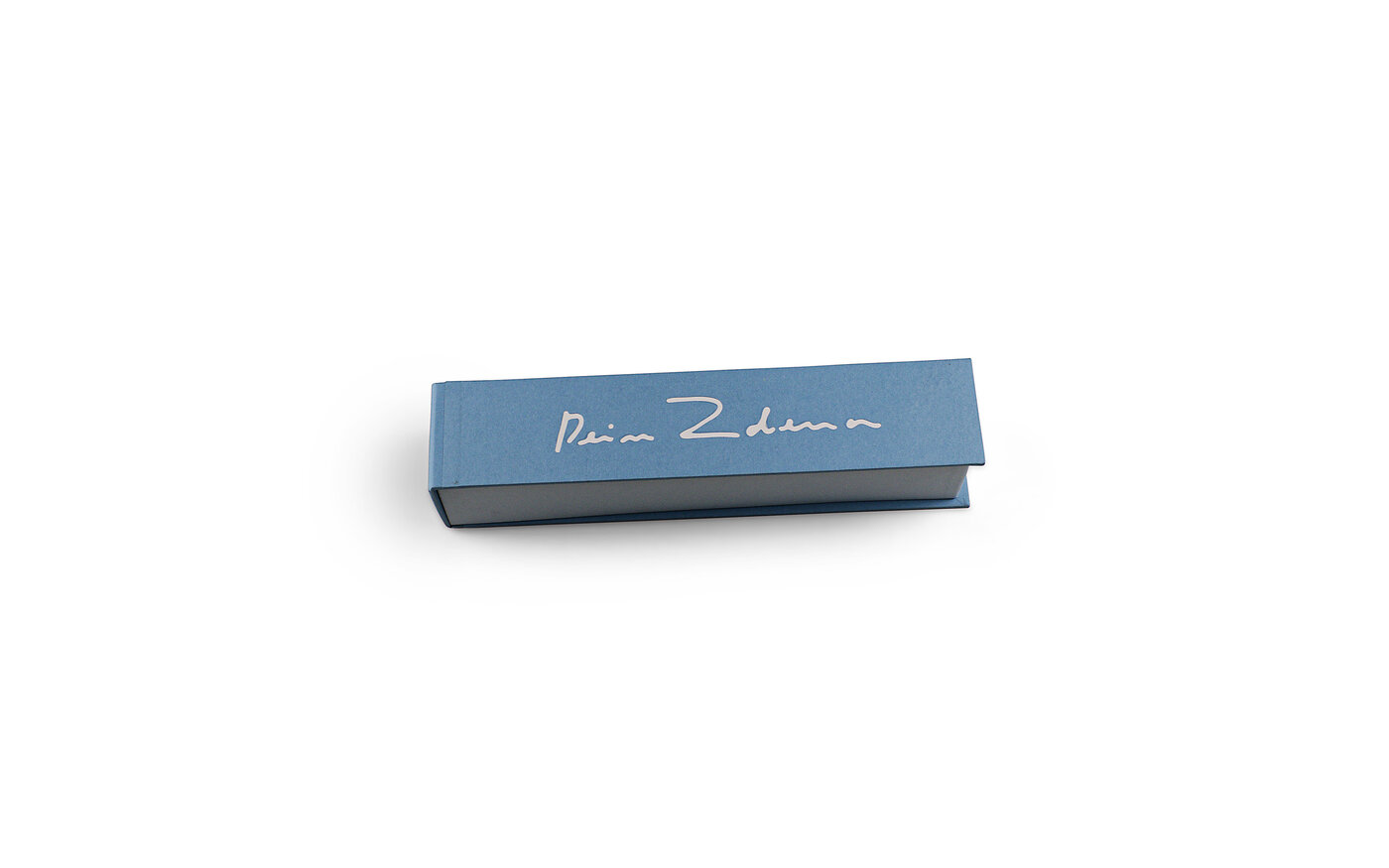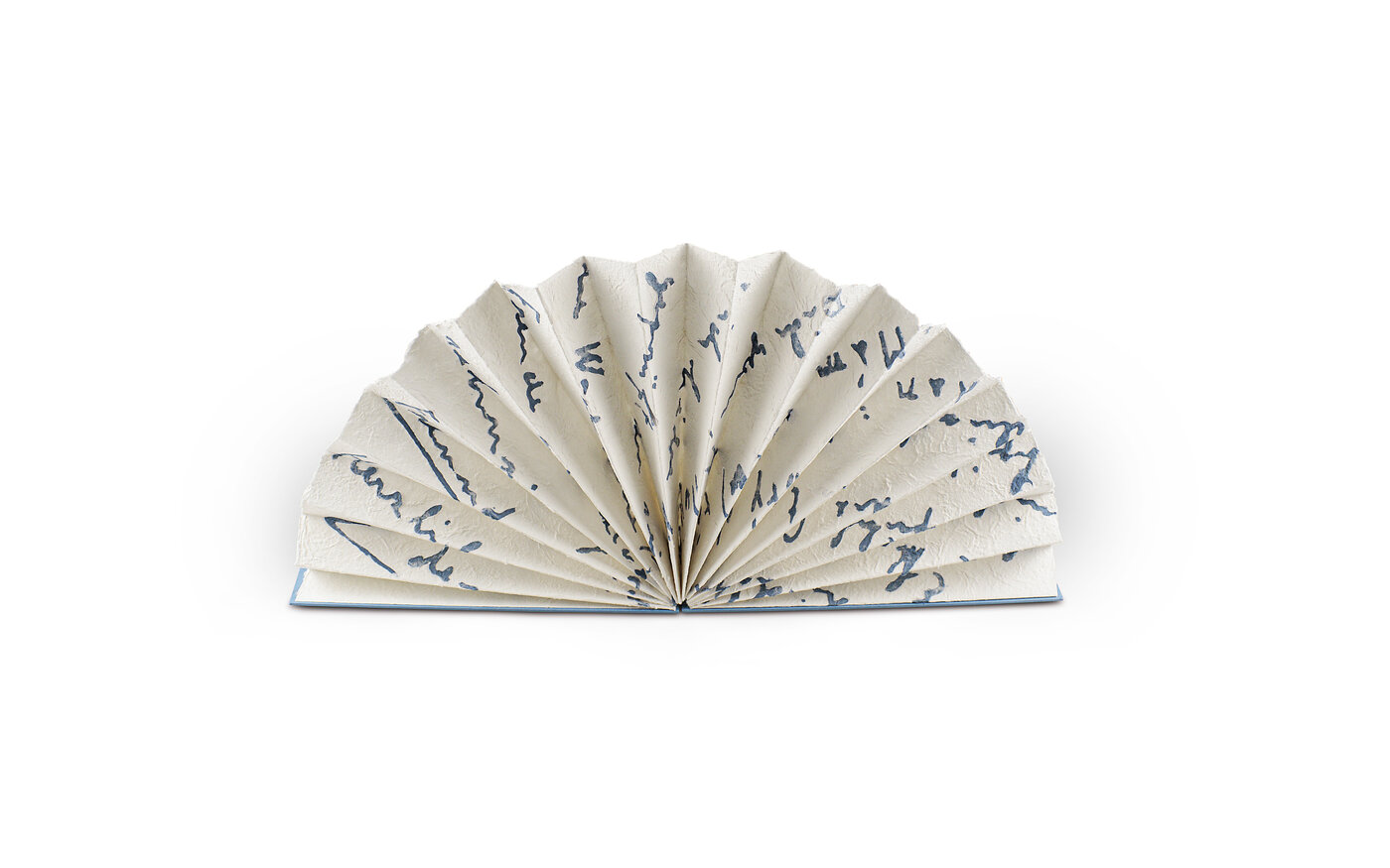 Das Buchobjekt ist Leporello und Fächer zugleich – je nachdem ob man die Buchdeckel an der Längs- oder Schmalseite aufschlägt. So oder so geöffnet, begegnen wir einem handschriftlichen Text-Fragment, das auf das handgeschöpfte Papier weder geschrieben noch gedruckt wurde: Die Schrift, aus blau gefärbter Pulpe in eine Form gegossen, wurde anschließend – vergleichbar mit einer Intarsienarbeit – in eine weiße Negativform eingesetzt. Es ist ein Ausschnitt aus einem der vielen heimlichen Liebesbriefe zwischen dem deutschen Soldaten Eberhardt Brucks und dem tschechischen Nachhilfelehrer Zdeněk Beneš aus dem Jahr 1944.