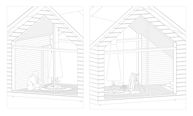 Ein weiterer Bestandteil der Berghütte, eine wärmegedämmte Holzhütte aus Brettsperrholzwänden mit vorgehängter Weißtannen-Fassade, ist lediglich mit einem Kamin ausgestattet und bietet Schlafgelegenheiten für bis zu vier Personen.