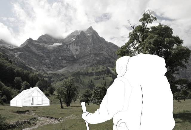Einen Teil der Berghütte stellt die schützende Außenhaut dar. Nach dem Vorbild von Schutzhütten wie sie in den Wäldern Europas häufig zu finden sind, dient das Dach aus Cortenstahl als Unwetterschutz, sowie als Wetterhaut für die folgenden beiden Gebäudeteile.