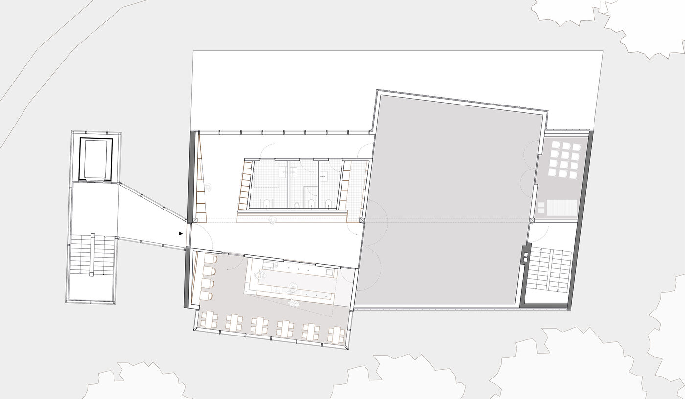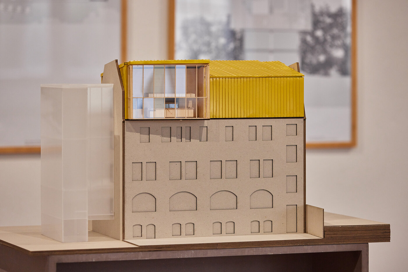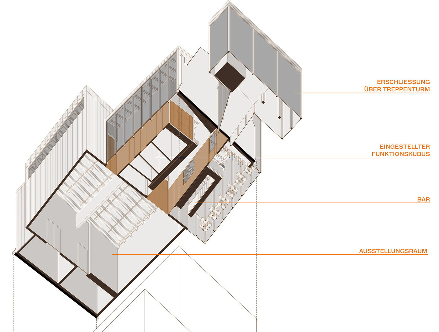Erschlossen wird das neue Dachgeschoss über einen vorgesetzten Treppenturm aus Glas. Dieser ermöglicht eine flexible Erschließung unabhängig der Nutzung in den darunter liegenden Geschossen und wird als neues Element klar sichtbar. Der neu aufgesetzte Holzbau besteht auf zwei formgleichen Kubaturen mit Pultdächern, die an einem Punkt um 180° gespiegelt sind. Die Dachneigungen zeigen somit in entgegengesetzte Richtungen. Das eine Dach ist mit seinem höchsten Punkt nach Norden gerichtet und hat eine weitgehend geschlossene Fassade. Darin befindet sich ein Ausstellungsraum. Das gegenüberliegende Pultdach ist Richtung Süden ausgerichtet und öffnet sich durch die Glasfassade zur Stadt hin. Dort kann man in einer Bar die Eindrücke der Ausstellung und den Ausblick auf sich wirken lassen