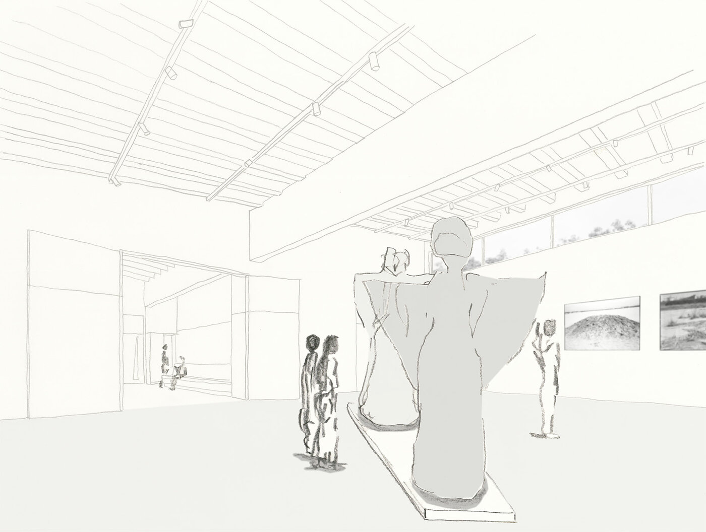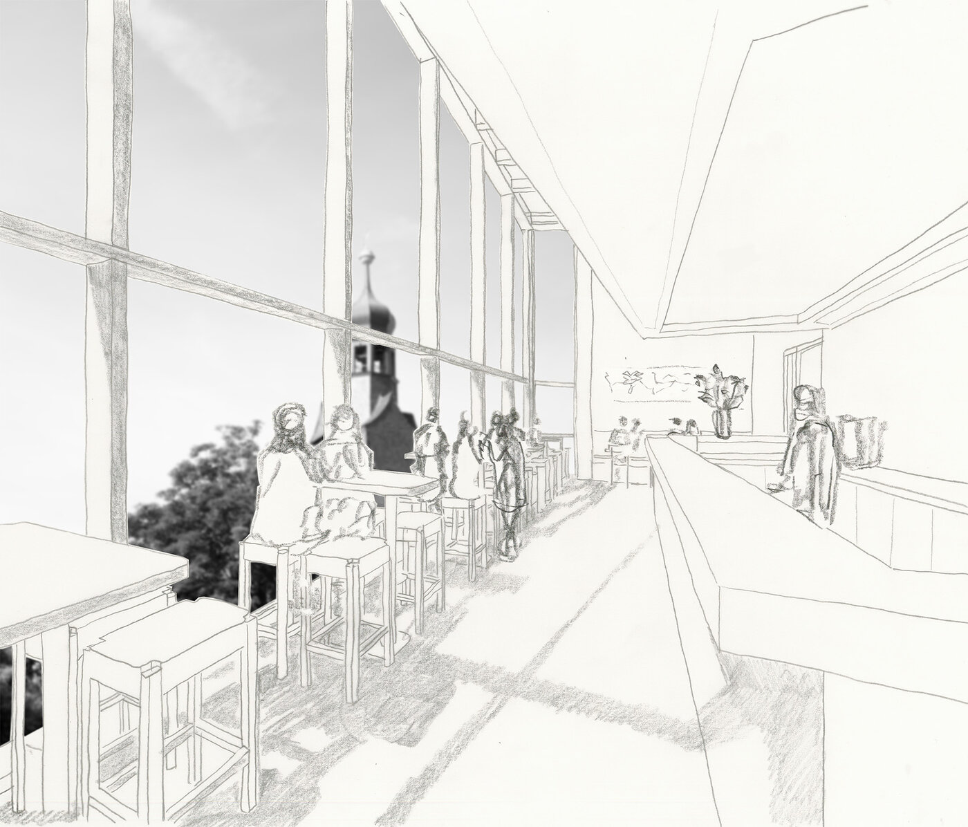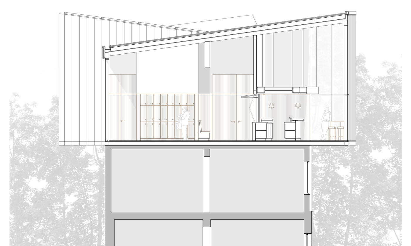 Erschlossen wird das neue Dachgeschoss über einen vorgesetzten Treppenturm aus Glas. Dieser ermöglicht eine flexible Erschließung unabhängig der Nutzung in den darunter liegenden Geschossen und wird als neues Element klar sichtbar. Der neu aufgesetzte Holzbau besteht auf zwei formgleichen Kubaturen mit Pultdächern, die an einem Punkt um 180° gespiegelt sind. Die Dachneigungen zeigen somit in entgegengesetzte Richtungen. Das eine Dach ist mit seinem höchsten Punkt nach Norden gerichtet und hat eine weitgehend geschlossene Fassade. Darin befindet sich ein Ausstellungsraum. Das gegenüberliegende Pultdach ist Richtung Süden ausgerichtet und öffnet sich durch die Glasfassade zur Stadt hin. Dort kann man in einer Bar die Eindrücke der Ausstellung und den Ausblick auf sich wirken lassen