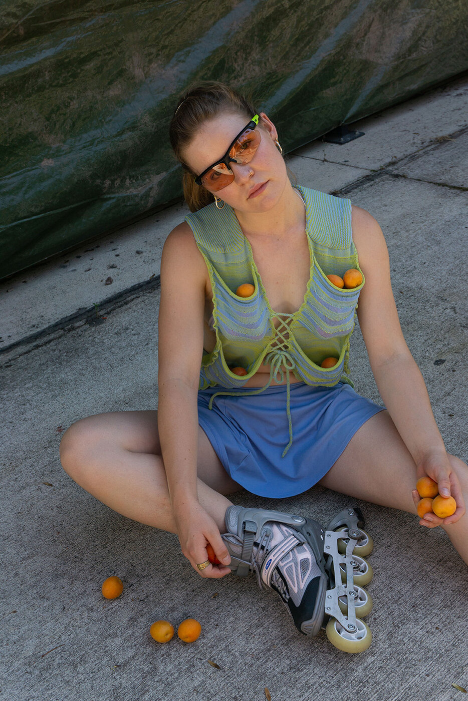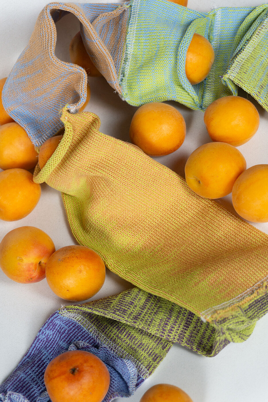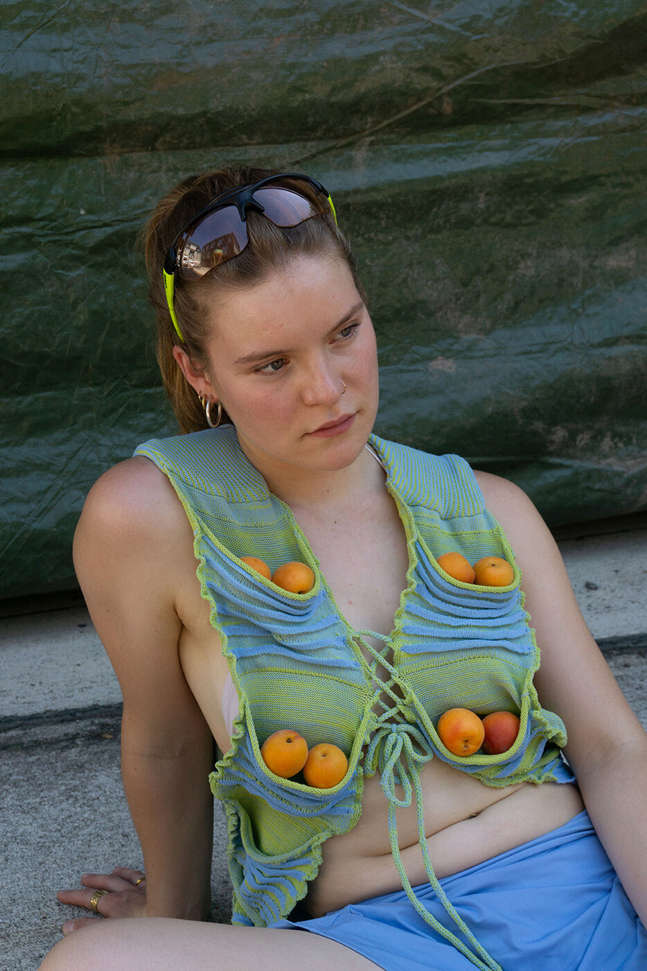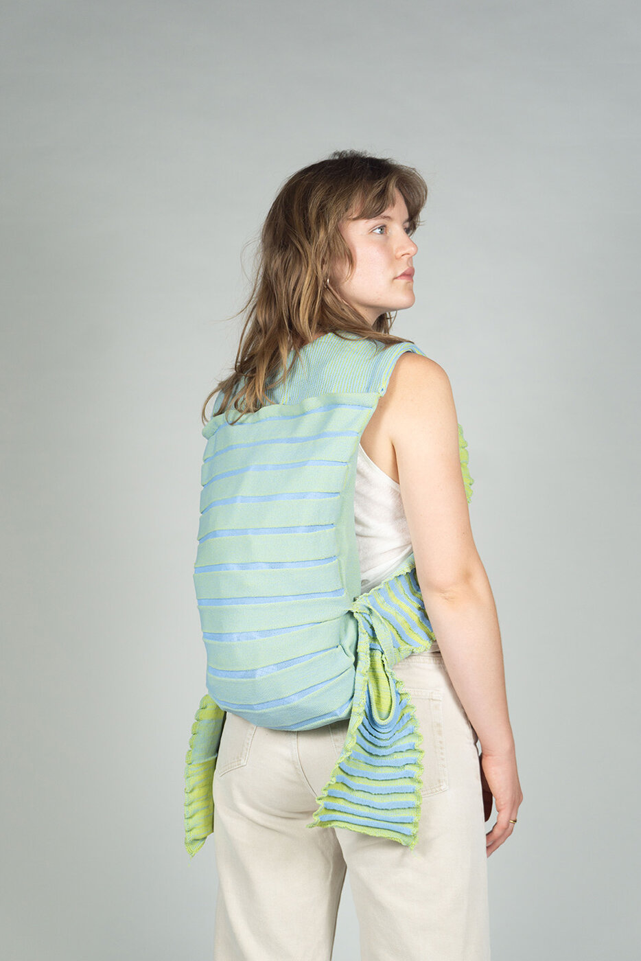 Inspiriert wurde das Konzept von Laufwesten, wie sie von Marathonläufer:innen getragen werden. Das verwendete Garn besteht aus dem Monomaterial Econyl (recyceltes Nylon) der Firma Aquafil und kann nach Ende seiner aktuellen Nutzung wieder vollständig regeneriert werden.