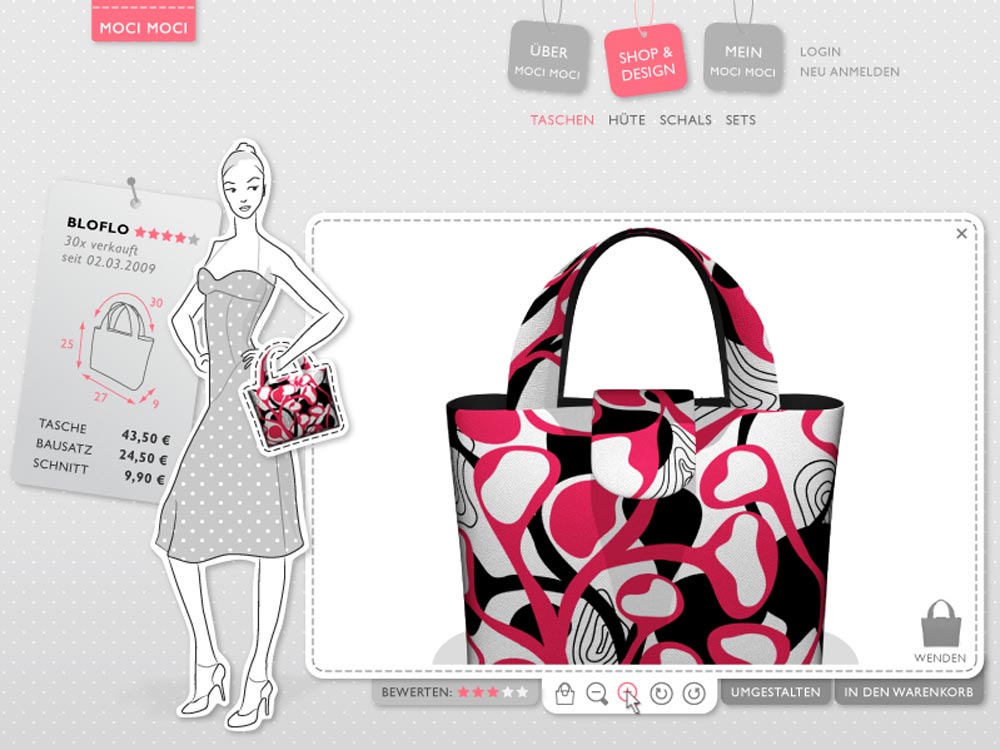 Der Kunde kann Stoffe von MOCI MOCI wählen oder eigene Entwürfe auf den Stoff drucken lassen. Hat der Kunde einen Stoff, aus dem er eine Tasche nähen will, kann er unter »eigene Stoffe verwenden« ein Foto des Stoffes hochladen und auf dem Modell anzeigen lassen. Die Farben der MOCI MOCI Stoffmuster sowie die Farbe der Nähte sind ebenfalls individuell anpassbar.