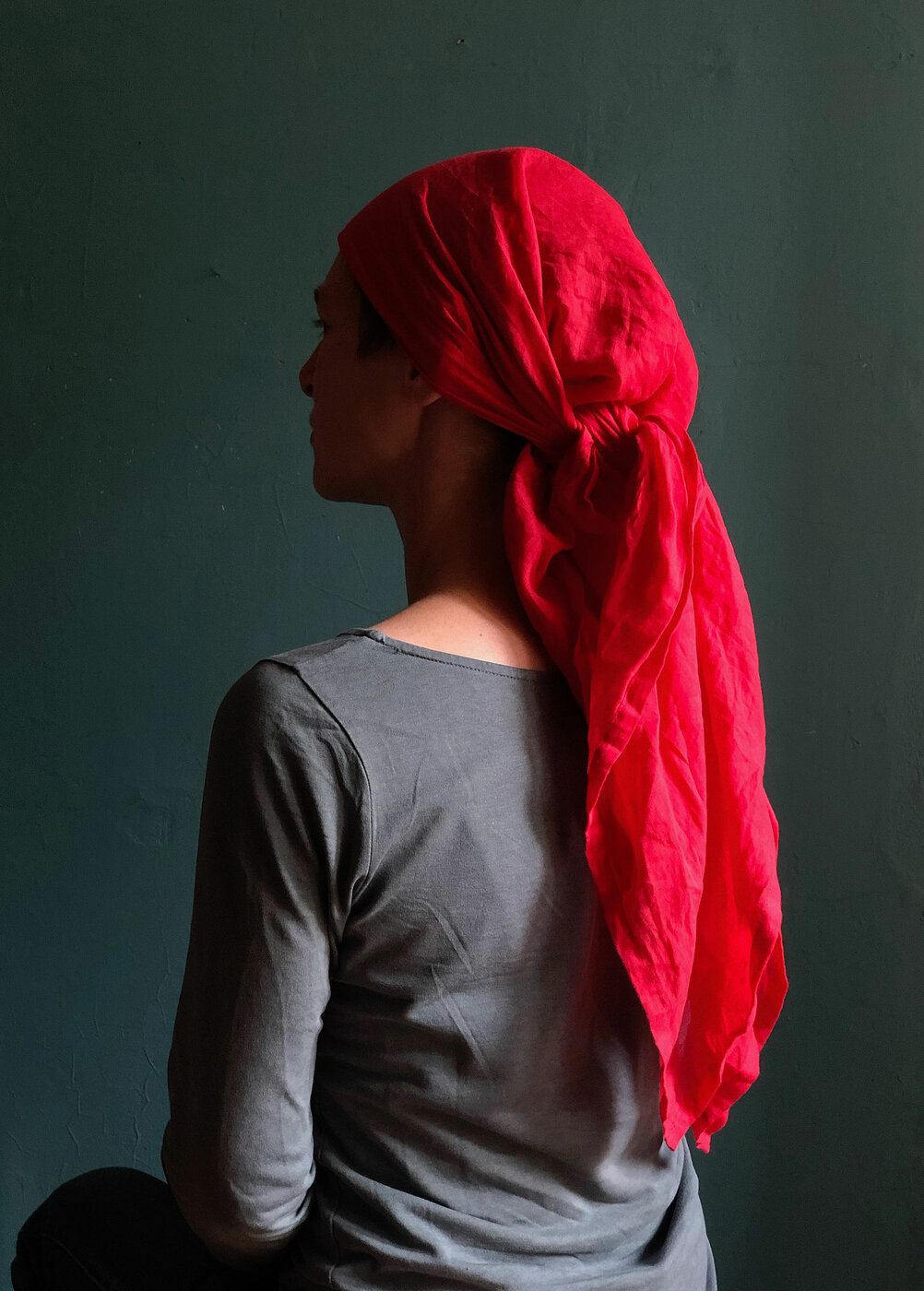Ein weiterer Teil der Arbeit ist das rote Tuch, „das Arbeiterkampflied“; ein sichtbarer Eingriff in den Raum. Es nimmt Bezug auf die Geschichtsträchtigkeit des Volksparks und seiner Idee vom „Heim" der Arbeiterklasse. Im Vorfeld rief die Künstlerin dazu auf, ihr einzelne rote Tücher zukommen zu lassen (einst Erkennungsmerkmal beim Einlass zu politischen Kundgebungen), um sie zu einem Ganzen zu verbinden. „Gewachsen“ ist ein Banner, welches denen vor Ort zur Seite „steht“. Es hing für 3 Monate am Volkspark in Halle.
