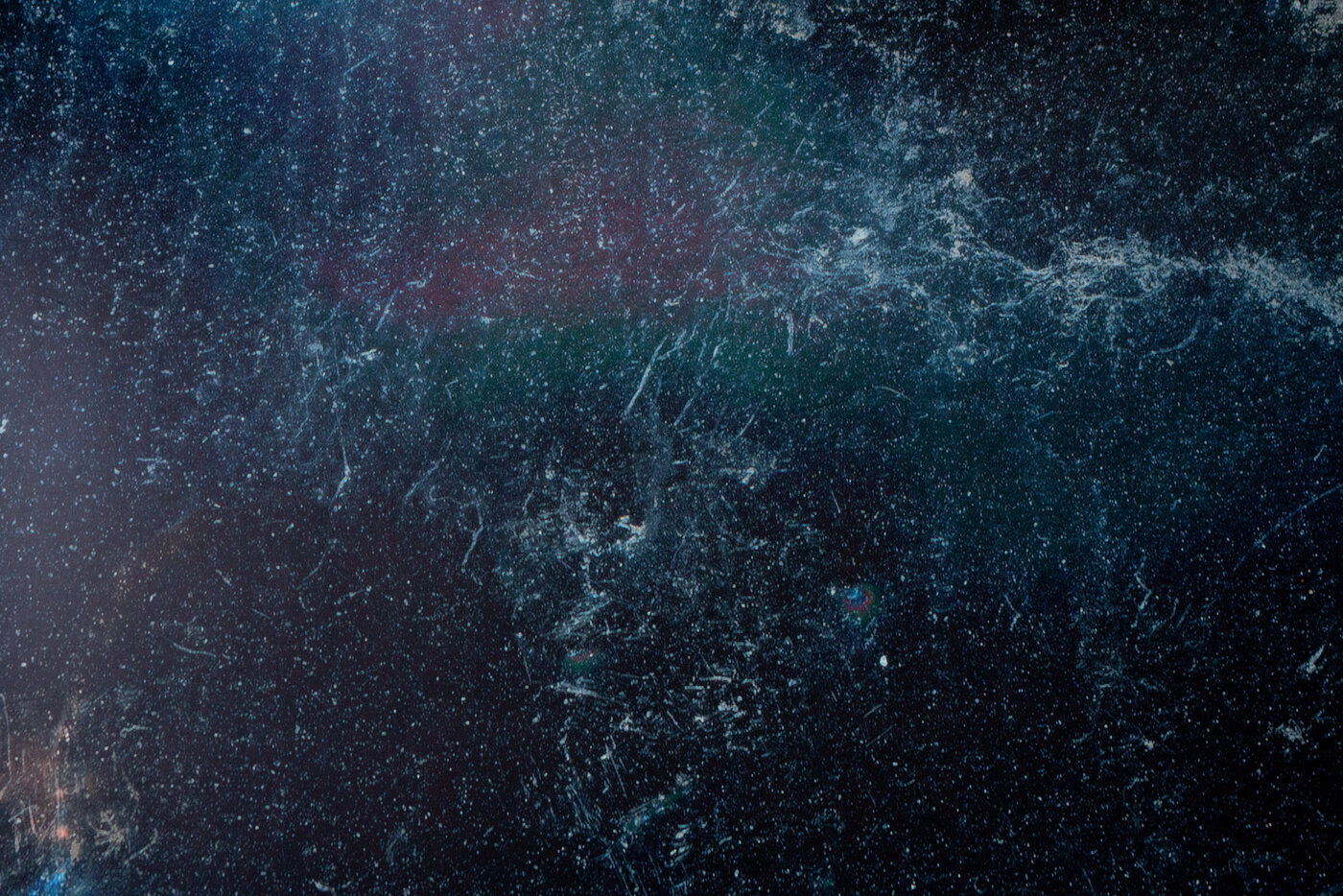 Eine Fotografie einer kleinbürgerlichen Familie der 60er Jahre, die im grauen Mondstaub liegt. Ein Fußabdruck.