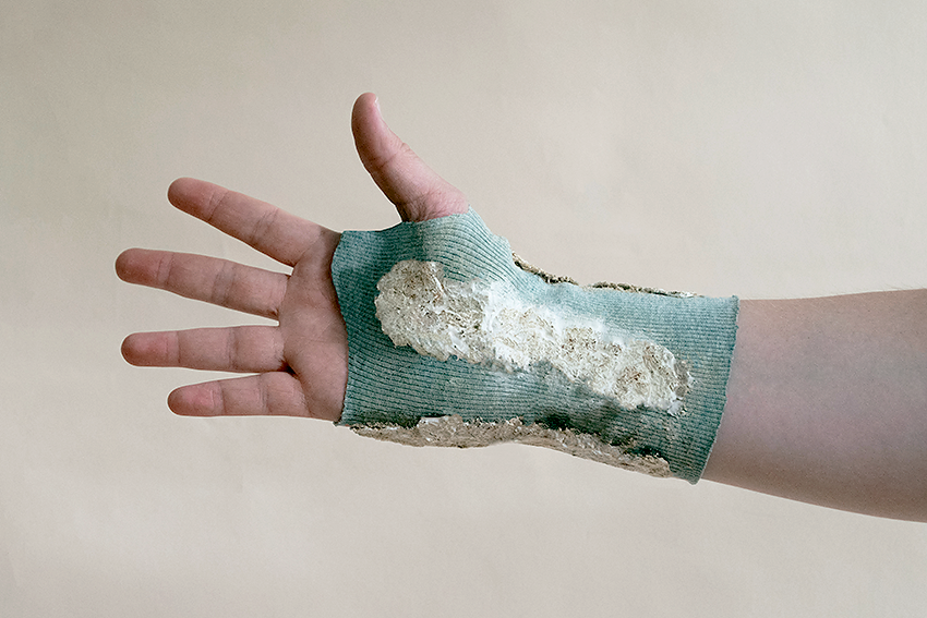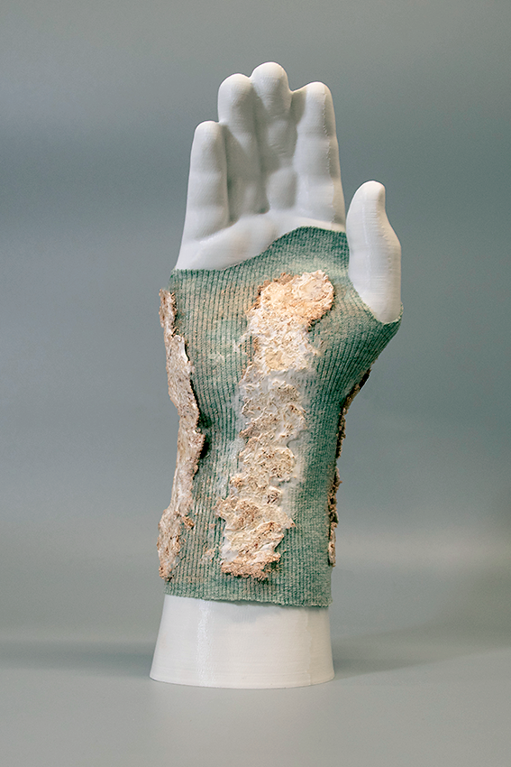 Explorativ entstanden Materialproben aus Myzelverbundstoffen, wie Hanf und Alginat. Als Bin demittel dient das Hydrogel Alginat, das in pastöser Konzentration auch 3D-gedruckt werden kann. Auf ein Textil aufgetragen, bewirkte der mit Myzel durchzogene Verbundstoff eine partiel le Versteifung, die die Stabilisierungswirkung einer Orthese nachbilden kann.