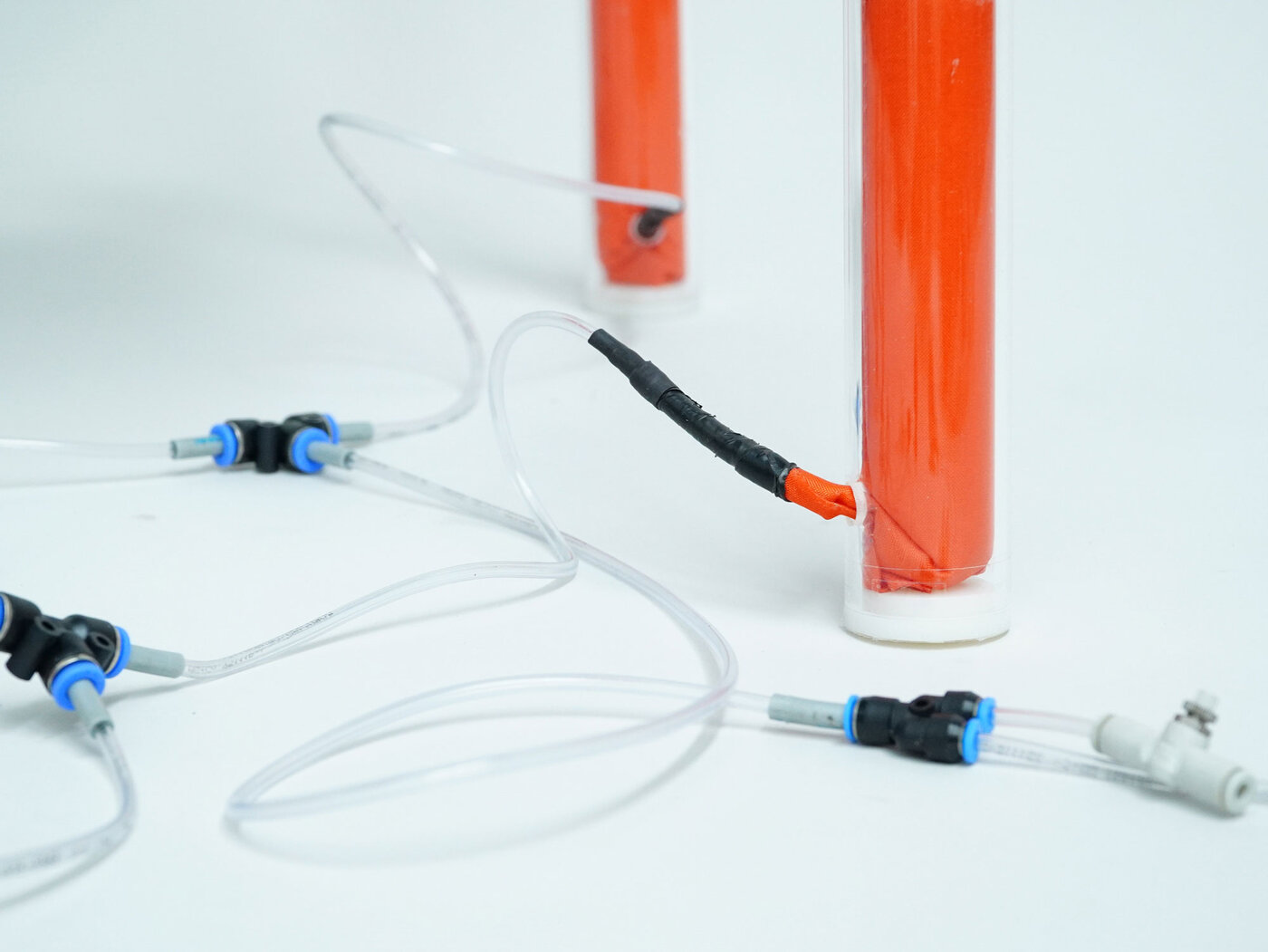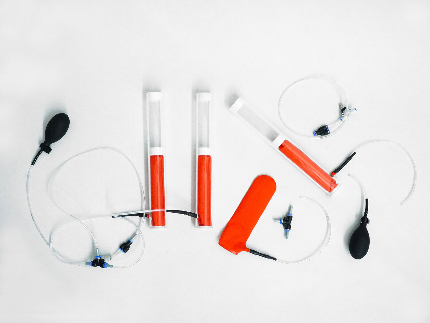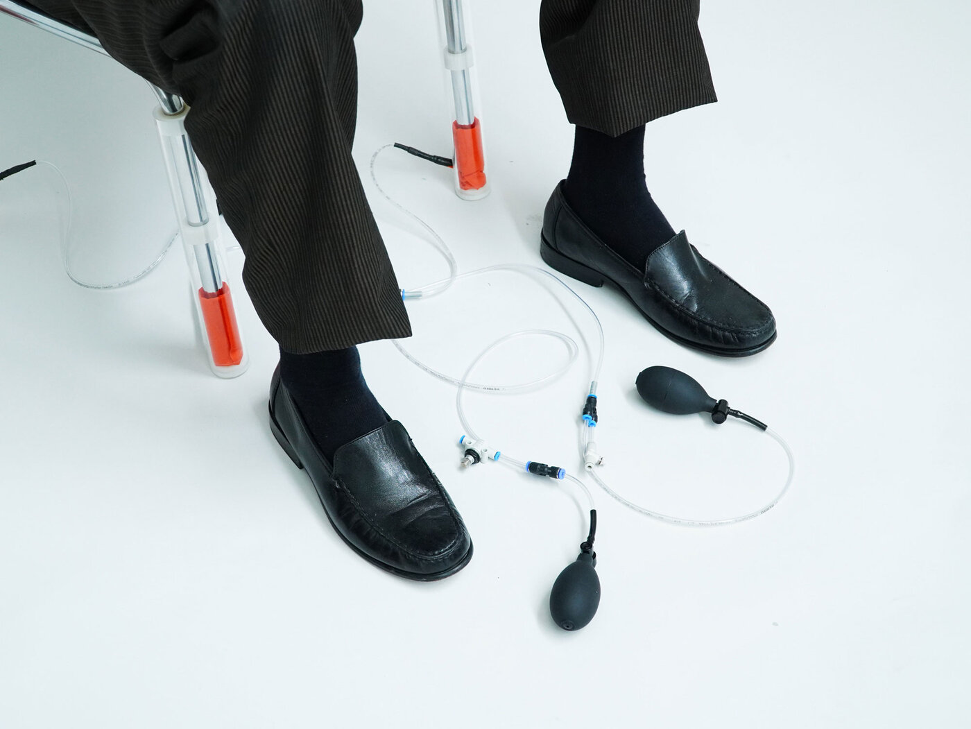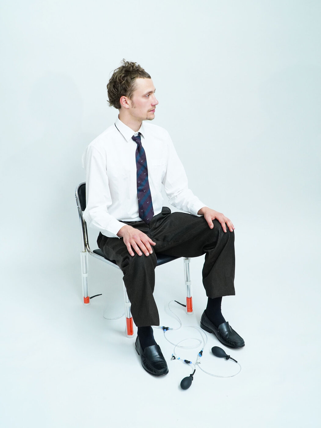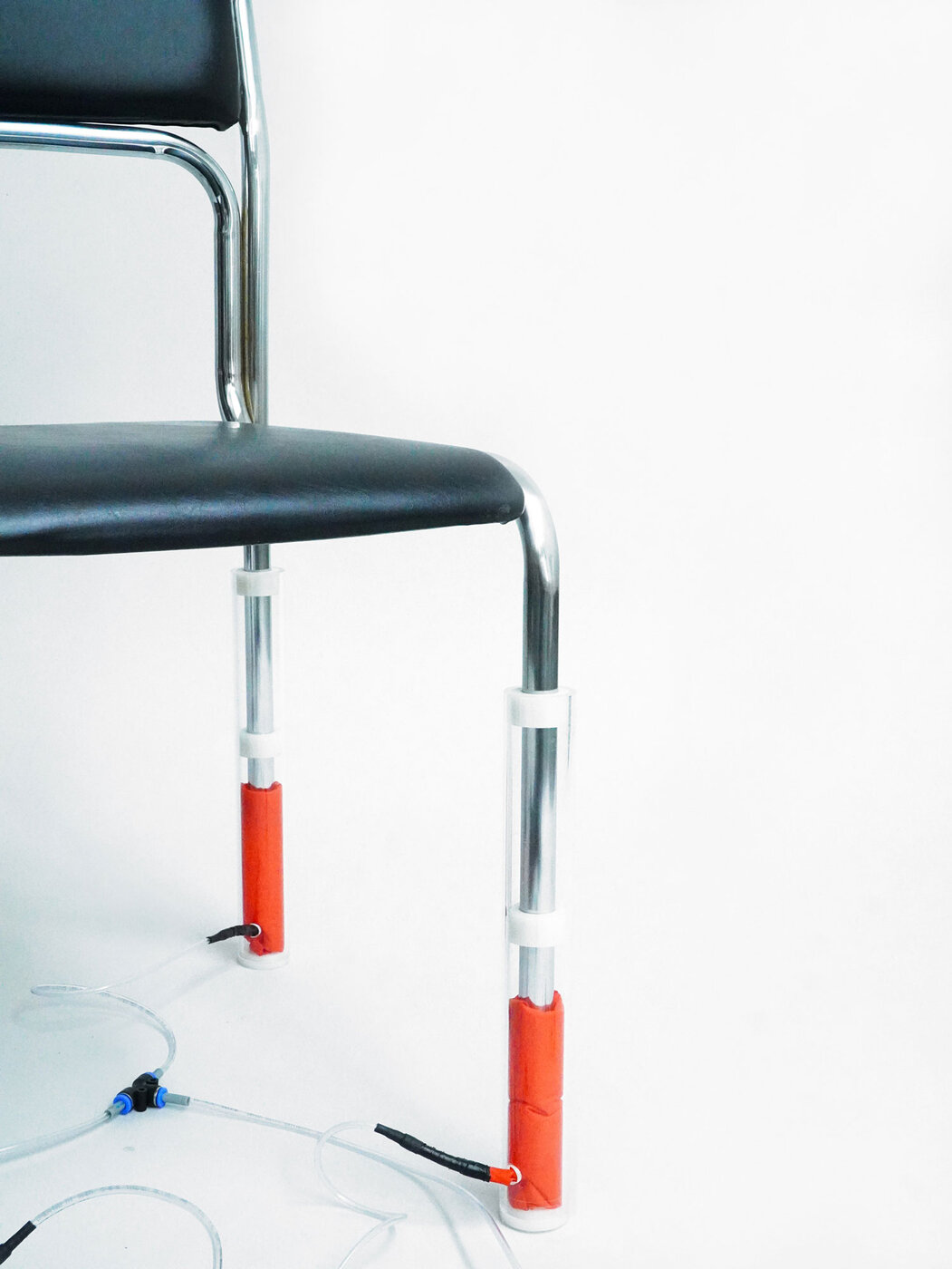 Für viele Menschen gehört das Sitzen zum Alltag. Wir sitzen am Küchentisch, beim Arbeiten und in der Freizeit – Wir sitzen viel. Obwohl das Sitzen auch eine Entspannung für bestimmte Körperbereiche bedeutet, so führt langes und monotones Sitzen doch in vielen Fällen zu Schmerzen, Verspannungen und Durchblutungsstörungen. Der Stuhl PFFFH... will diesem Problem begegnen und aktives Sitzen fördern. Durch ein pneumatisches Aufstecksystem können die Stuhlbeine mit Hilfe zweier, an den Füßen befestigten Handpumpen auf- und abbewegt werden. Zwei Rückstoßventile sorgen dafür, dass die Kissen stetig Luftdruck verlieren. Um die gewünschte Sitzhöhe zu halten, muss also konstant Luft in das System gepumpt und somit der Körper bewegt werden.