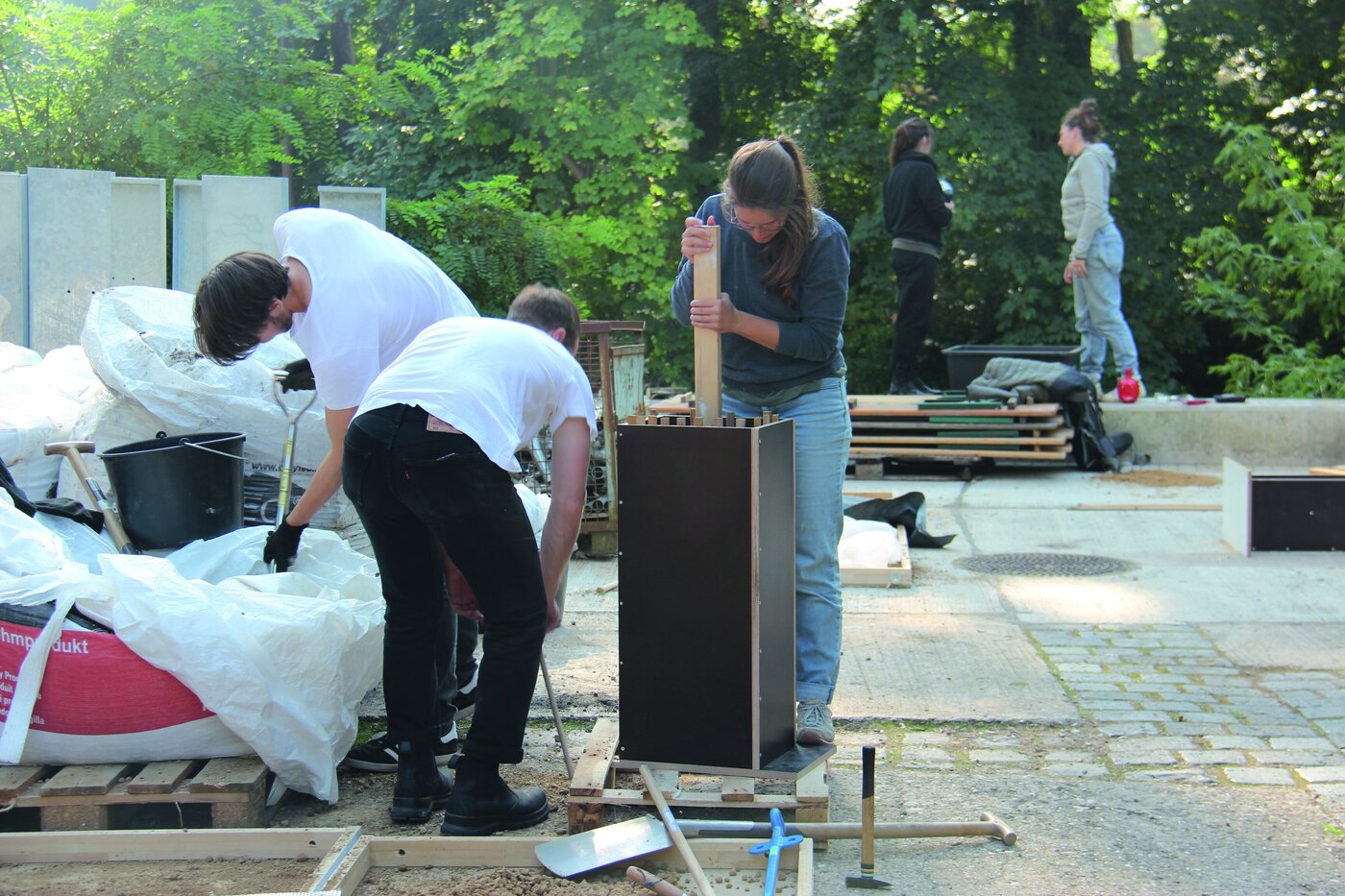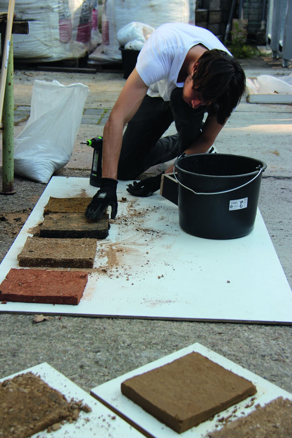 Giving us insight about her process in particular for the projects "plan 4(4)" and "Possible Patterns", Elise helped us opening up to the material and made us think about new contexts for employing earth as a material, leaving the better-known applications in architecture. In addition, she helped us to quickly overcome initial concerns and questions working with the rammed earth technique and mixture. The process of ramming earth into moulds constructed from plywood casing proved to be surprisingly simple. By the end of the day, alone or in groups, the participants followed own interests and free material experiments, exploring the potentials of developing the moulds or the texture and consistency of the clay mixture, composites and humidity.
