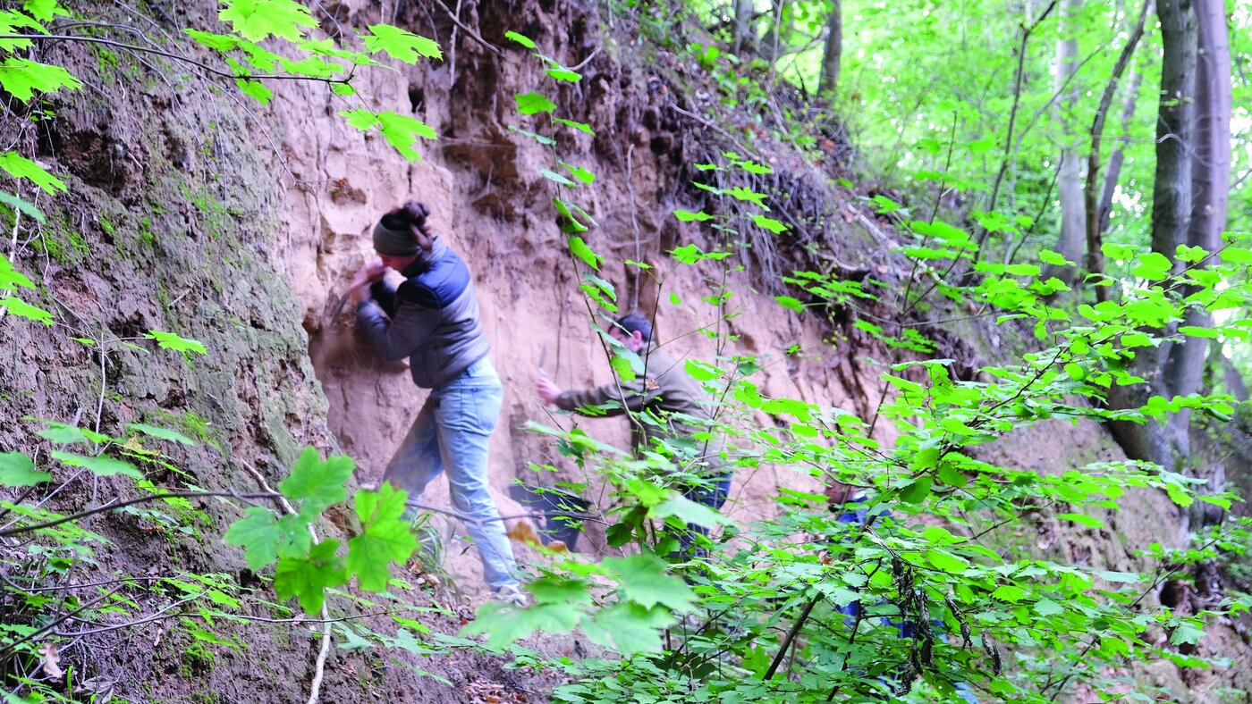 Prior to heading out to selected sites in the region, the group was introduced to several aspects influencing the construction with loam – such as the roles of geology and climate, building techniques, resources as well as the relevance of loam within cultural history. Following, the group headed towards Mücheln. Upon arrival, we visited Mücheln’s historical center as well as surrounding buildings, architectures made from cob and mudstone. In sharp contrast to the buildings that had been constructed several hundred years ago, we then inspected a historical residential area of Mücheln constructed in the 1950s using the rammed earth technique. Stopping by a privately owned farmhouse, we made our way to a sunken road leading through a natural loess site. After collecting several buckets of reference material, we arrived at our final stop in Kleinfahner.