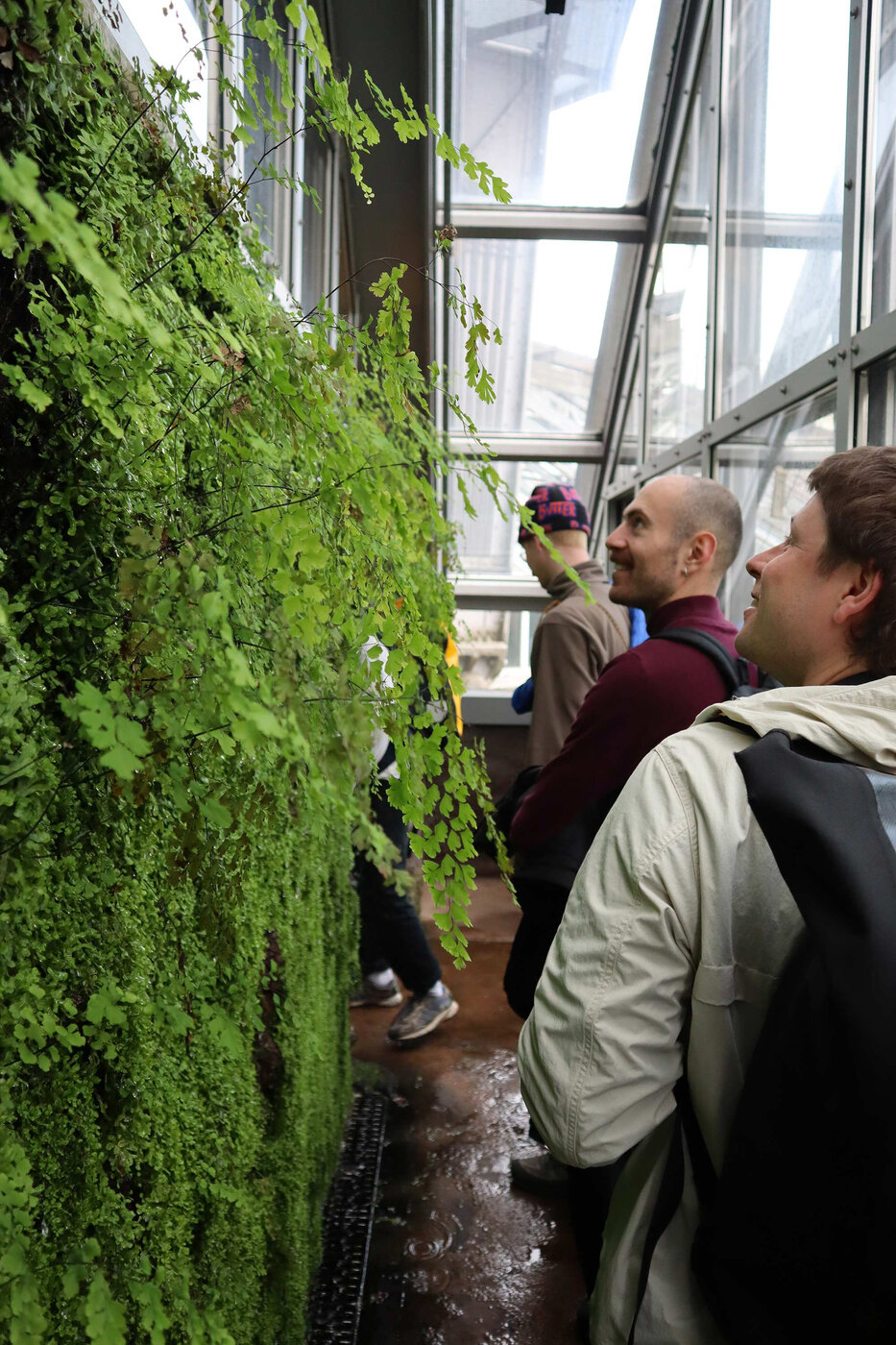 Am Dienstagnachmittag trafen wir uns mit Lynn Harles im Botanischen Garten Berlin. Sie ist Designforscherin und arbeitet an der Schnittstelle von Design und Naturwissenschaften. In ihren Arbeiten untersucht sie die Rolle von Gestaltung im Kontext des Anthropozäns. Dabei hinterfragt sie, wie Gestaltung in Zukunft verantwortungsvoll und reflektiert eingesetzt werden kann. Während des Rundgangs durch den Garten vermittelte Lynn Harles ihre Begeisterung für naturwissenschaftliche Zusammenhänge. Anhand verschiedener Beispiele erklärte sie das Konzept des anthropozänen Weltbildes. Sie wies darauf hin, dass unser menschenzentriertes Verständnis von Natur und Wissenschaft kritisch betrachtet werden muss. Denn es bedarf eines raschen Perspektivwechsels, um nachhaltige und zukunftsfähige Lösungen zu entwickeln. Ein weiterer Schwerpunkt der Führung lag auf der Geschichte des botanischen Gartens. Lynn Harles erläuterte, wie sich die Funktion im Laufe der Zeit verändert hat. Sie beschrieb die Rolle der Gärten im kolonialen Kontext, in dem Pflanzenwissen und Ressourcen systematisch aus anderen Regionen angeeignet wurden. Des Weiteren erklärte sie den wissenschaftlichen Nutzen zur Erforschung und Sammlung von Pflanzen und die Kultivierung von Heilpflanzen für medizinische Zwecke. Besonders eindrucksvoll war die Darstellung der Anpassungsfähigkeit von Pflanzen. Trotz ihrer Ortsgebundenheit haben sie im Laufe der Evolution vielfältige Lösungen entwickelt, um sich an Umweltbedingungen anzupassen. Am Beispiel von Kakteen wurden die Wachstumsstruktur, die Funktion ihrer Stacheln sowie ihre Strategien zum Schutz vor Fressfeinden erläutert. Pflanzen sind hochkomplexe Organismen, die über verschiedene Mechanismen verfügen, um miteinander zu kommunizieren und auf äußere Reize reagieren zu können. Einige Pflanzen sind zudem in der Lage, Umweltreize zu speichern und zukünftige Reaktionen darauf auszurichten. Andere nutzen wiederum Botenstoffe und Ultraschallwellen zur Kommunikation und Warnung vor Fressfeinden. Abschließend stellte Lynn Harles eine zentrale Frage in den Raum, welche wir uns als Gestalter:innen regelmäßig stellen sollten: Was können wir von der Natur lernen und was sollten wir ihr im Gegenzug zurückgeben?
