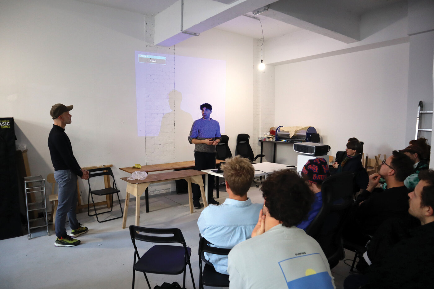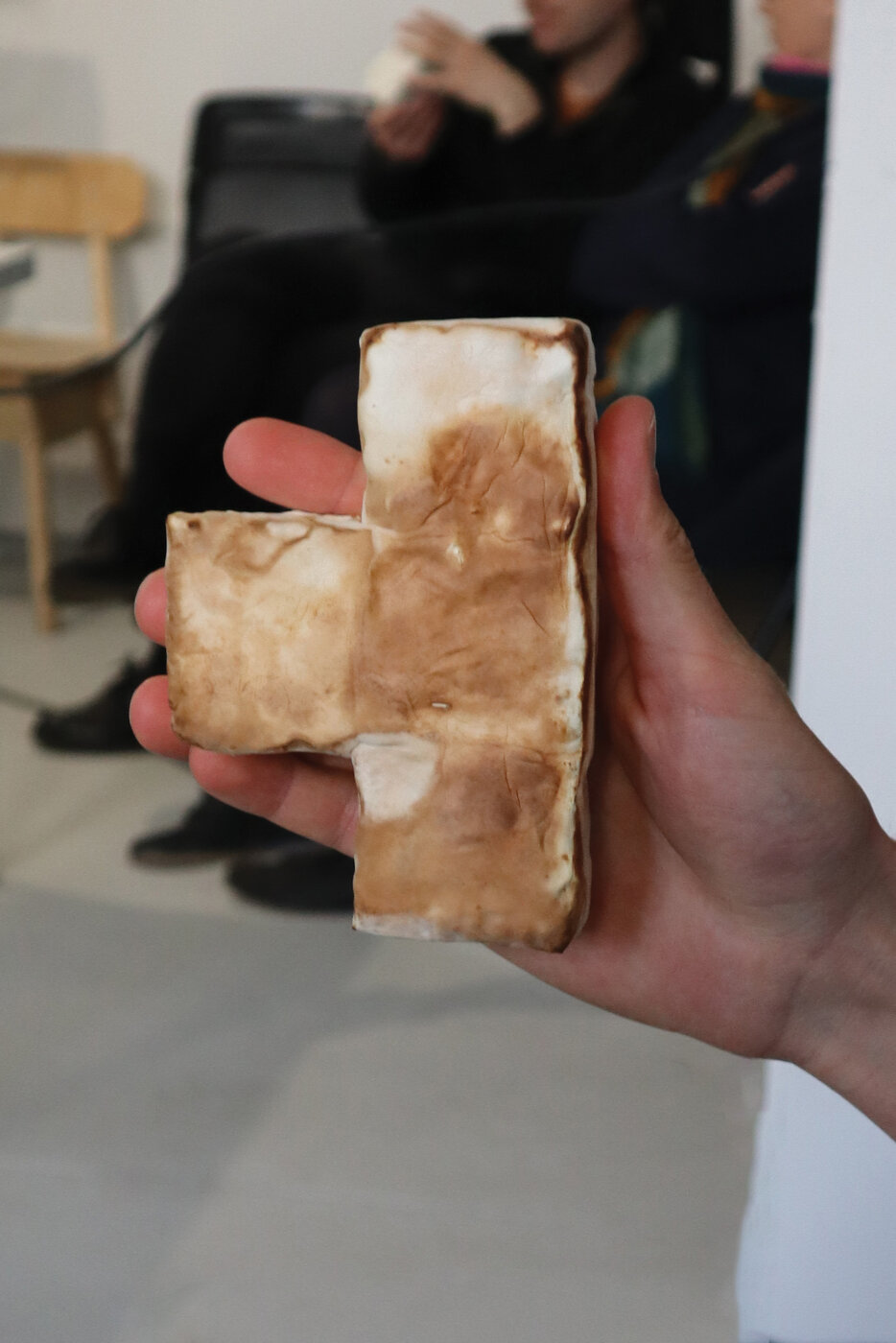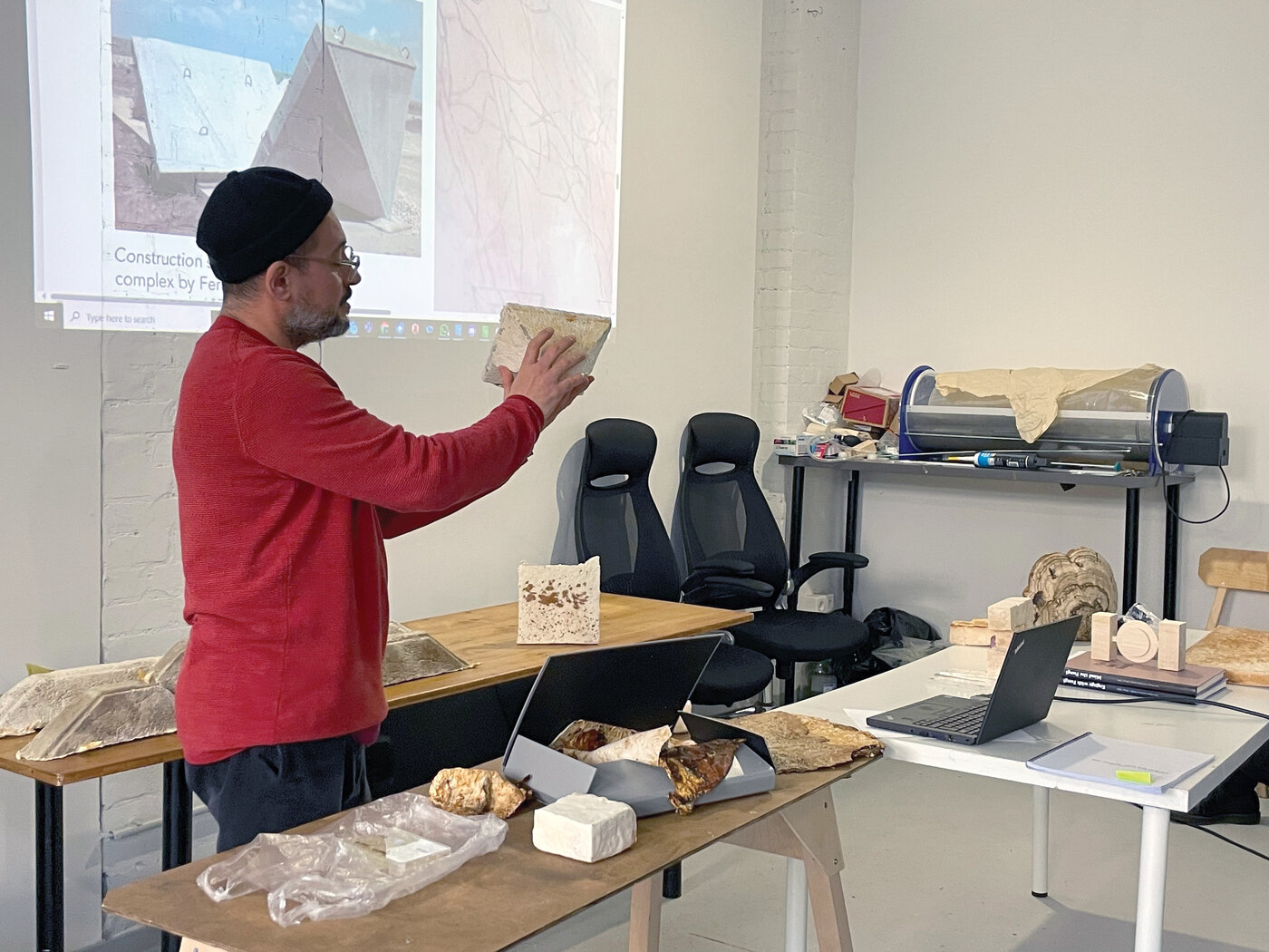 Die dritte Station der Berlin-Exkursion war das TOP Lab, ein offener Wissenschaftsraum, der auf Basis des TOP e.V. betrieben wird und sich dem Community-Biohacking und der Citizen Biology widmet. Alessandro Volpato stellte die Philosophie des Labors vor, die auf Open-Source-Experimenten, demokratischem Zugang zu Biotechnologie und interdisziplinärer Zusammenarbeit basiert. Das Semesterthema „Microbial Production Enhanced by Machine Interaction” (Durch Maschineninteraktion verbesserte mikrobielle Produktion) wurde von Mareike vorgestellt, die den Designer als Vermittler zwischen lebenden Systemen und technologischen Komponenten darstellte. Mindaugas Gapsevicius (Miga) bot eine kritische Perspektive auf die Biomaterialindustrie, stellte das „timber model” in Frage und plädierte für nicht-menschenzentrierte Designansätze, die ökologische Perspektiven integrieren. Alessandros Einführung in die Mykologie beleuchtete die Intelligenz und ökologische Rolle von Pilzen, gefolgt von praktischen Übungen mit biologischen Materialien. Zu den Highlights gehörten Schleimpilze (die dezentrale Entscheidungsfindung demonstrieren) und Mycofoam, eine biologisch abbaubare Alternative zu synthetischen Schaumstoffen auf Myzelbasis. Weitere Beispiele waren Sylia-Leder und Mycotetris – ineinandergreifende Myzelblöcke, die von der Logik von Tetris inspiriert sind. Anschließend stellten die ansässigen Künstler und Experimentatoren ihre Projekte vor: Silvio untersuchte kubanische modernistische Architekturformen, indem er Shiitake-Myzel zu geometrischen Strukturen formte. Alve präsentierte Amass, bei dem aus Kombucha gewonnene bakterielle Zellulose für 3D-gedruckte Kleidungsstücke verwendet wird, und experimentierte mit Hydrogelen für flexible, biologisch gewachsene Formen. Ein spekulatives Spirulina-Algen-Konzept schlug die Verarbeitung menschlicher Abfälle zu nachhaltigem 3D-Druckfilament vor und löste eine Diskussion über Kreislaufwirtschaft und biologische Sanierung aus. Der Besuch bot Einblicke in die Schnittstelle zwischen Biologie, Design und Open-Source-Innovation und betonte das Potenzial von Mikroben- und Pilzsystemen als Kooperationspartner in der Material- und Produktentwicklung.