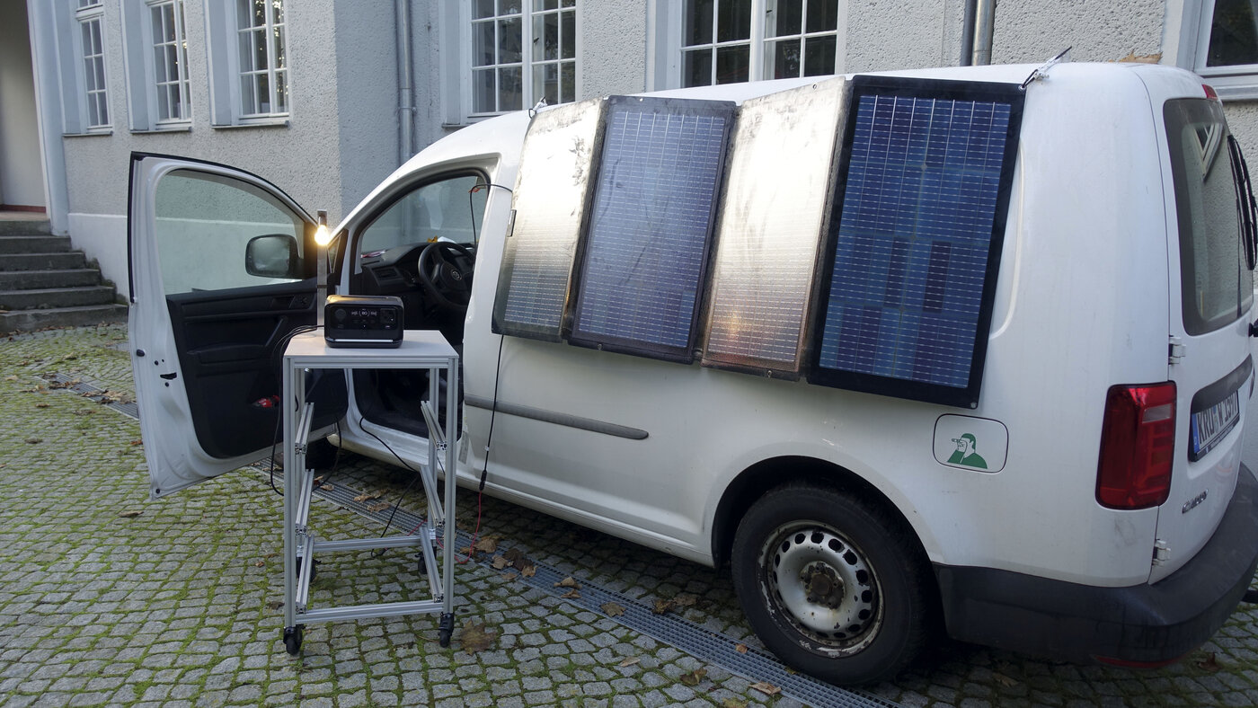 Der künstlerische Mitarbeiter Andi Wagner stellte uns dieses Modul als Möglichkeit zur mobilen Energiegewinnung auf Messen oder Veranstaltungen vor. In Verbindung mit einer Batterie kann beispielsweise ein kleiner Messestand samt Beleuchtung autark betrieben werden. Ohne zusätzliche Batterie wäre eine Nutzung jedoch kaum möglich. Das faltbare Modul lässt sich zusammenklappen, in einer Tasche verstauen und leicht transportieren.