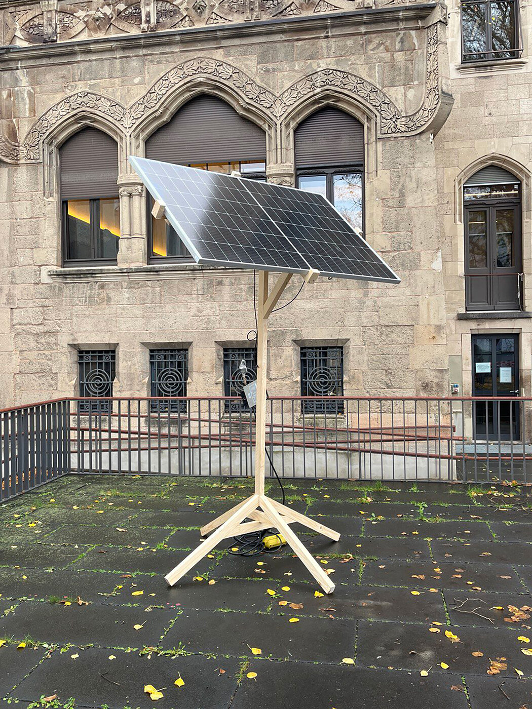 Das andere Modul ist ein klassisches „Balkonkraftwerk“, das im Baumarkt erhältlich ist und üblicherweise in größeren Anlagen auch auf Gebäudedächern installiert wird. Dabei handelt es sich um ein PV-Modul in standardisierter Normgröße, das zusammen mit einem Wechselrichter und einem Anschlussstecker verkauft wird. Der Wechselrichter ermöglicht es, die erzeugte Sonnenenergie (Gleichstrom) direkt in den Stromkreislauf eines Haushalts einzuspeisen.