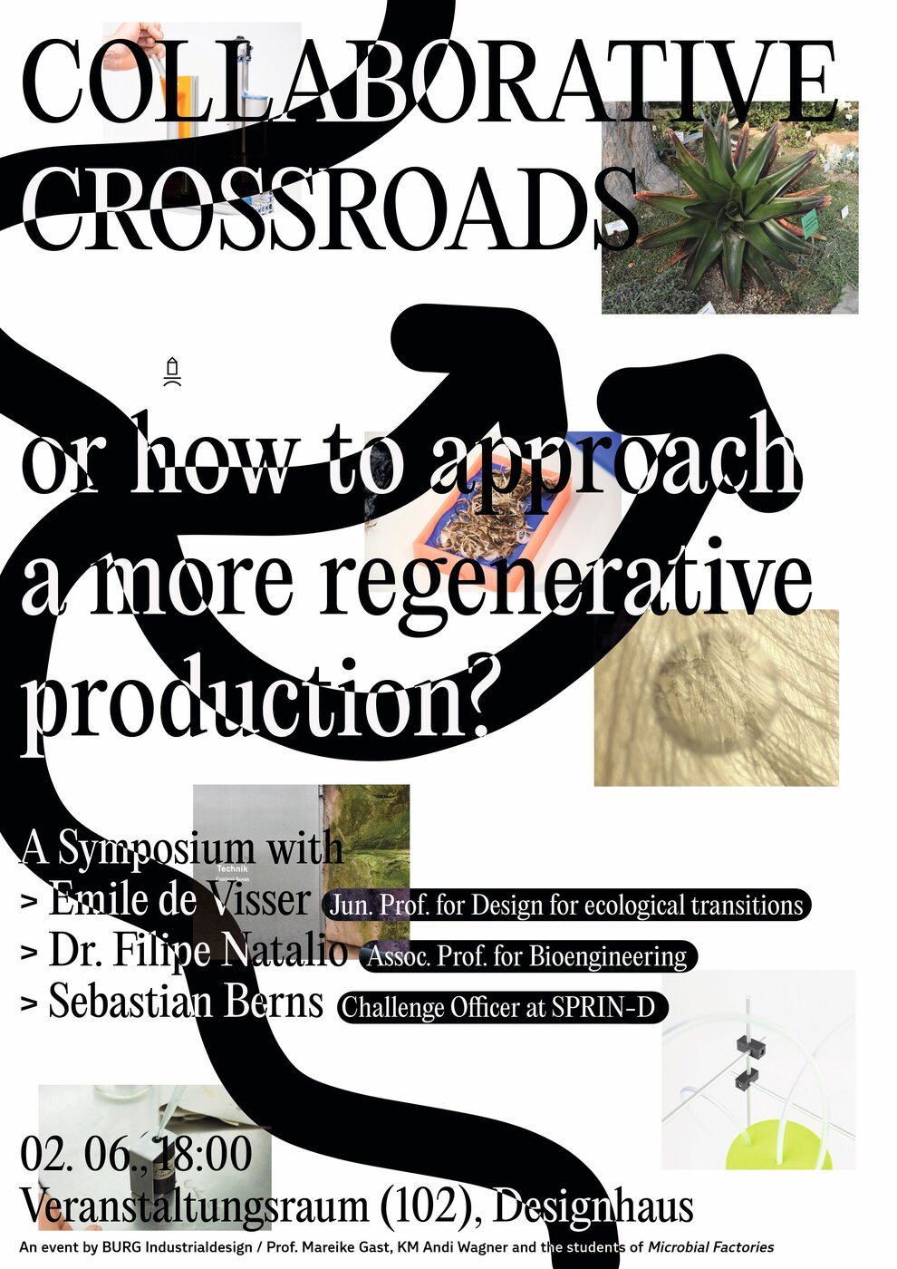 Im Anschluss an die zweite Zwischenpräsentation findet das Symposium mit dem Titel „Collaborative Crossroads“ statt. Es thematisiert die Verbindung von Design und Biotechnologie, insbesondere im Hinblick auf neue Möglichkeiten der Materialproduktion. Im Fokus steht die Frage, welche Rolle Designer\*innen bei der Weiterentwicklung biotechnologischer Verfahren und deren Überführung in alltagstaugliche, gesellschaftlich akzeptierte Anwendungen spielen können. Dabei werden industrielle Maschinen, Mikroorganismen und gestalterische Prozesse als potenziell verknüpfbare Elemente untersucht. Als Gäste sind der Biochemiker und Materialwissenschaftler Filipe Natalio, der Designforscher Emile de Visscher (ENS Paris-Saclay) sowie Sebastian Berns von der Bundesagentur für Sprunginnovationen SPRIND eingeladen. Aufgrund einer kurzfristigen Erkrankung kann Filipe Natalio nicht teilnehmen. Emile de Visscher hebt in seinem Beitrag hervor, welche Kompetenzen für Studierende im Bereich des interdisziplinären Designs besonders relevant sind. Neben gestalterischer Kreativität seien analytisches Denken sowie Offenheit gegenüber anderen Fachdisziplinen essenziell. Forschung sei für ihn ein integraler Bestandteil des Designprozesses. Entscheidend sei das ausgewogene Zusammenspiel von wissenschaftlicher Methodik und gestalterischem Denken – ohne dabei eines dem anderen unterzuordnen. Sebastian Berns erläutert die Arbeitsweise von SPRIND. Die Agentur schafft gezielt Strukturen für interdisziplinäre Zusammenarbeit, etwa zwischen Design und Wissenschaft. Unterstützt werden vor allem Projekte mit hohem Innovationspotenzial, die aufgrund ihres frühen Entwicklungsstands als zu risikoreich für klassische Förderinstrumente gelten. Die Auswahl erfolgt durch aktives Scouting, starke Netzwerke und eine Offenheit für unkonventionelle Ideen. Das Symposium verdeutlicht, dass die Zukunft technologischer Entwicklungen nicht allein in neuen Verfahren liegt, sondern auch in der Art und Weise, wie diese gestaltet, vermittelt und in gesellschaftliche Kontexte eingebettet werden.