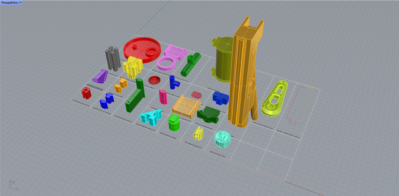 Eine Sammlung von 3D-gedruckten Teilen und Aluminiumprofilen, die die Teilnehmer mitbrachten, erleichterte den Einstieg in die Aufgabe. Diese kleine Sammlung von Bauteilen wurde im Laufe des Semesters von den Studierenden erweitert.