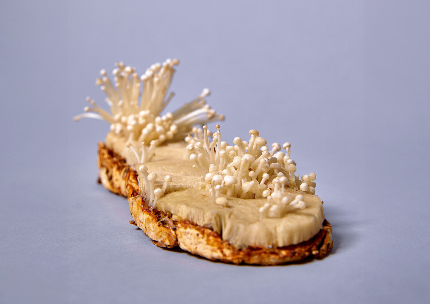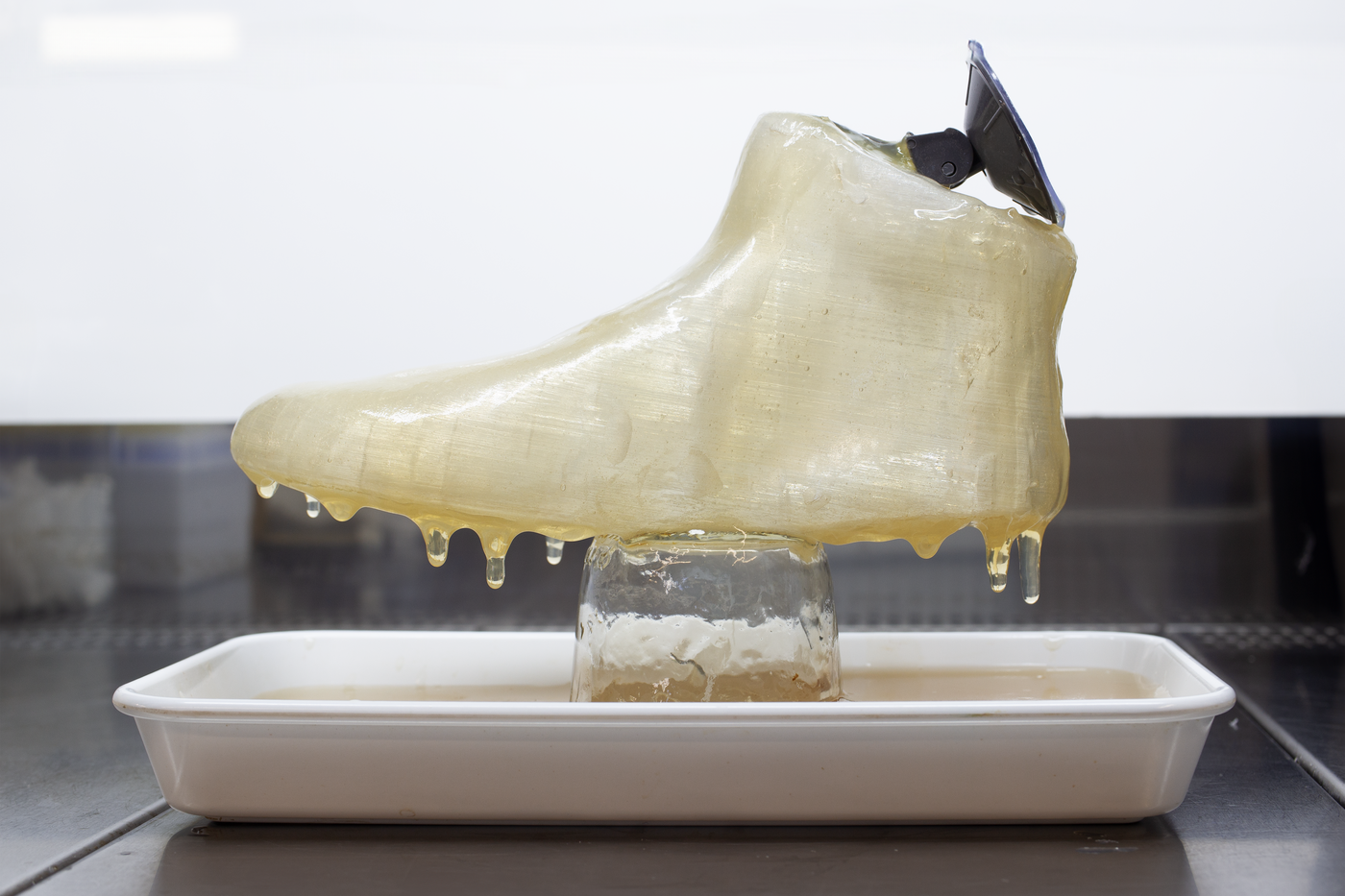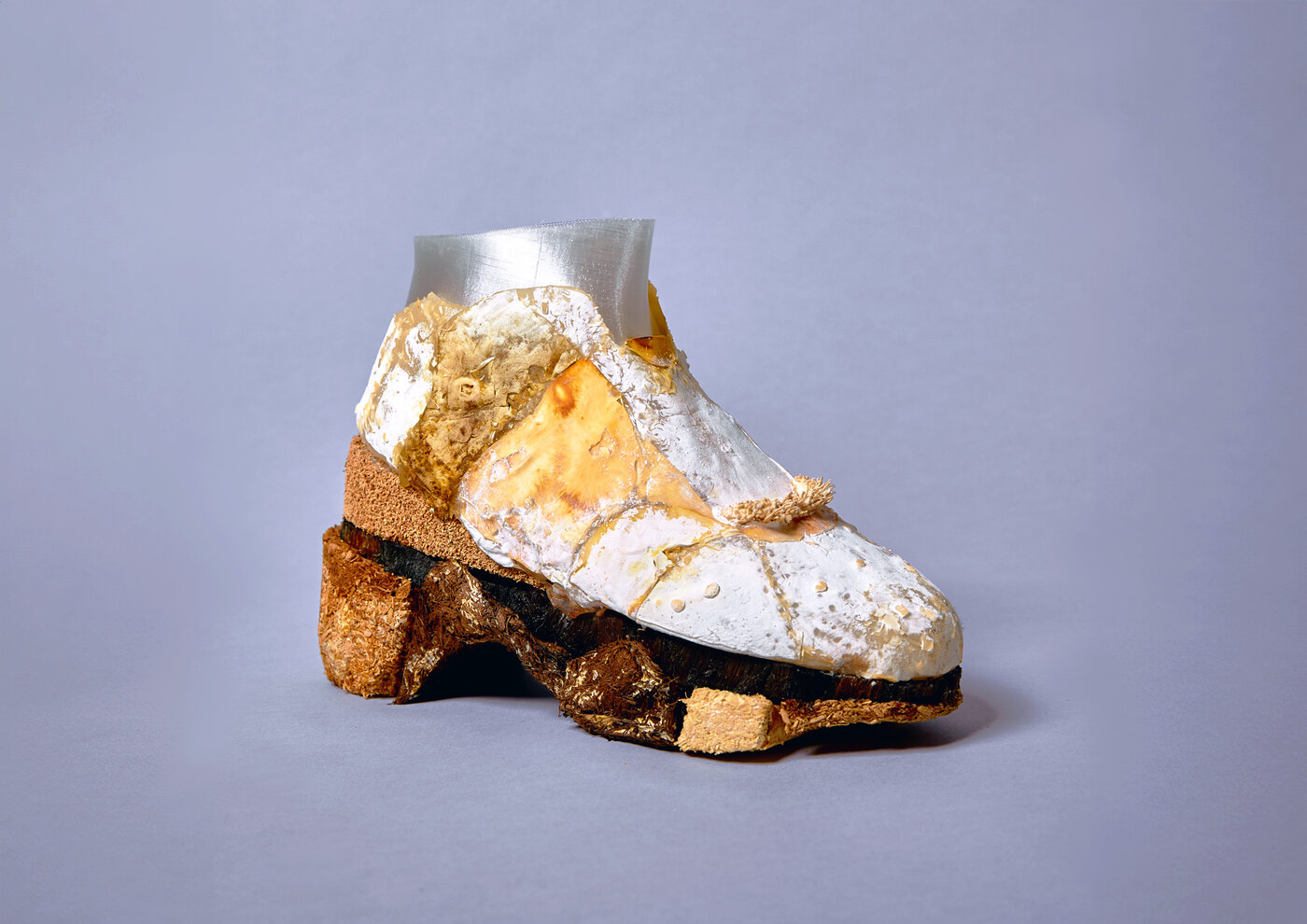 Die Idee des dreidimensional gewachsenen Schuhs, die im Projekt Habitat entstand, fand in Re/boot ihre prototypische Umsetzung. Dabei konzentrierten wir uns bewusst auf den Einsatz von Pilzen. Ihre Vielfalt an Materialeigenschaften – besonders die Kombination von Myzel und Fruchtkörpern – hatte ausreichend Potenzial, die unterschiedlichen Anforderungen eines Schuhs abzudecken. Gleichzeitig half die Fokussierung auf eine Organismenart, die Komplexität zu reduzieren, denn die gleichzeitige Kultivierung verschiedener Organismen stellt für sich bereits eine gro ße Herausforderung dar.