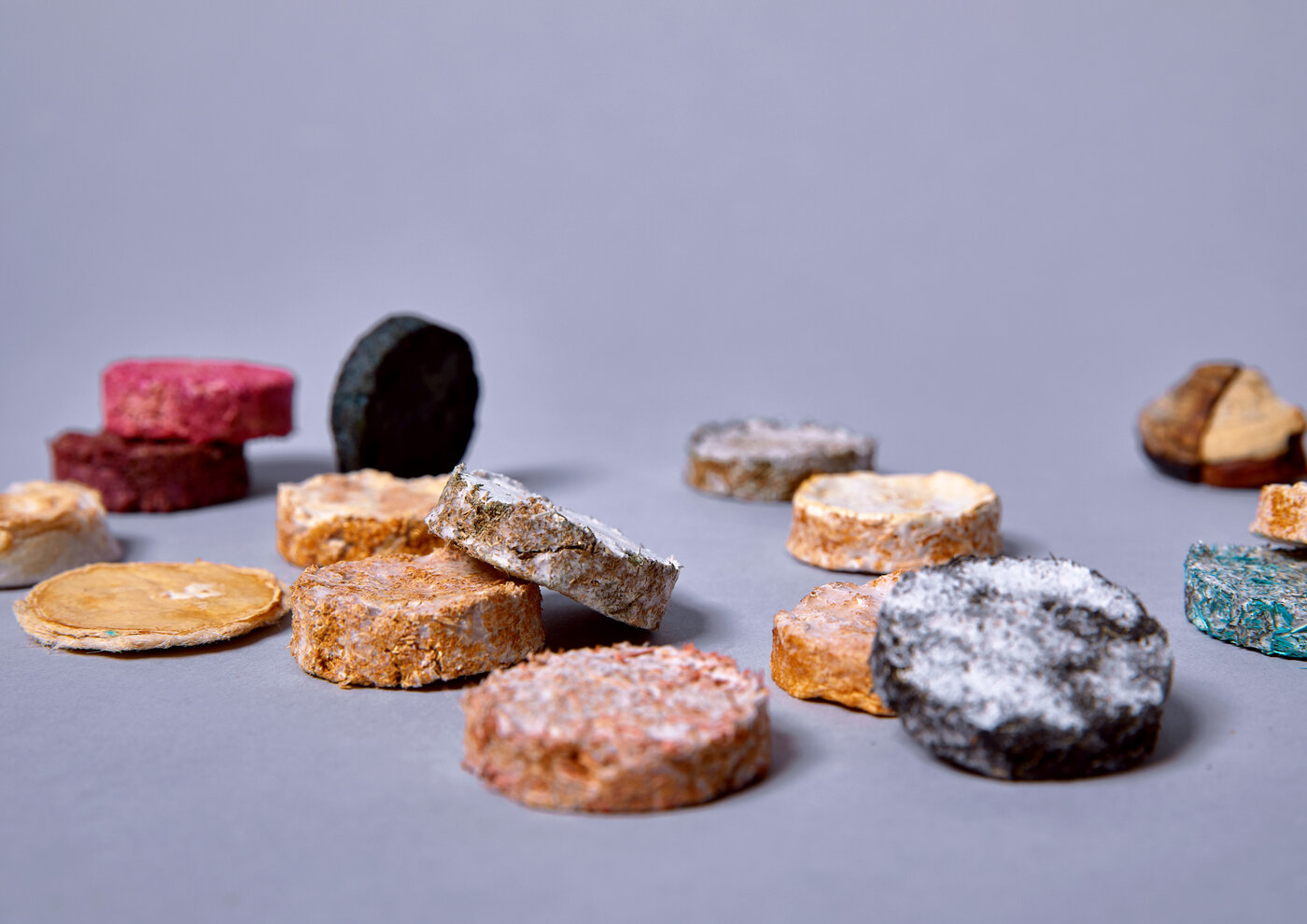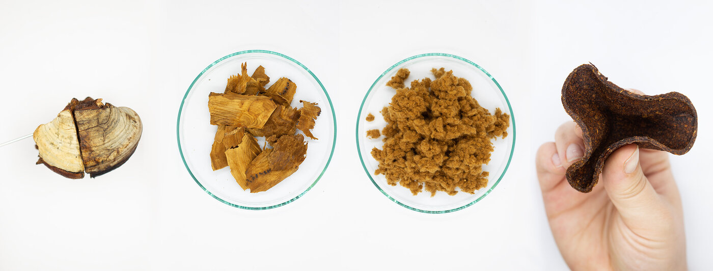 Für die verschiedenen Funktionsbereiche des Schuhs wählten wir unterschiedliche Pilzarten sowie verschiedene Bestandteile der komplexen Organismen aus. Für den Schaft und den flexiblen Teil der Sohle bot sich der Einsatz von Myzel an, da es nicht nur schnell wächst, sondern auch selbstheilende und bindende Eigenschaften besitzt. So kann sich der Schuhschaft bei kleinen Beschädigungen teilweise selbst reparieren.