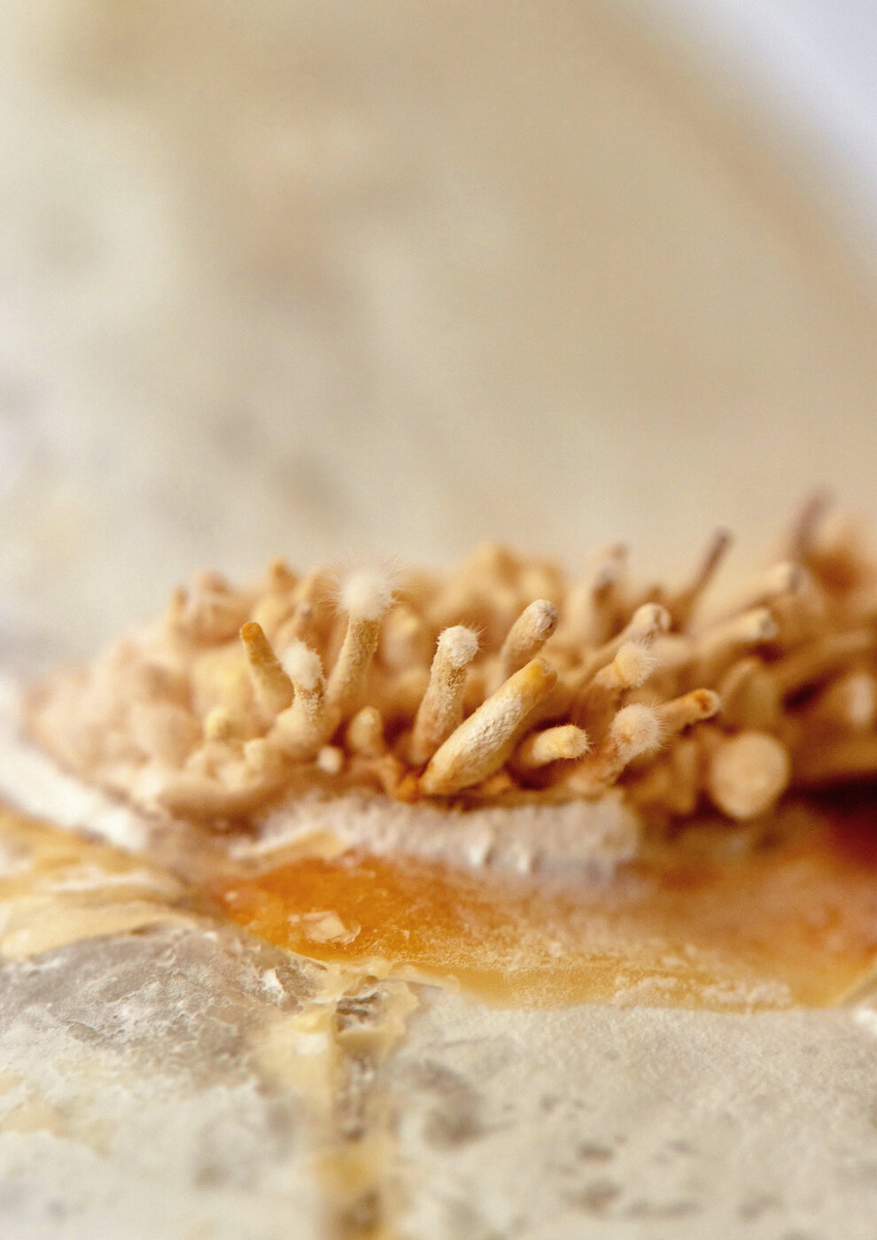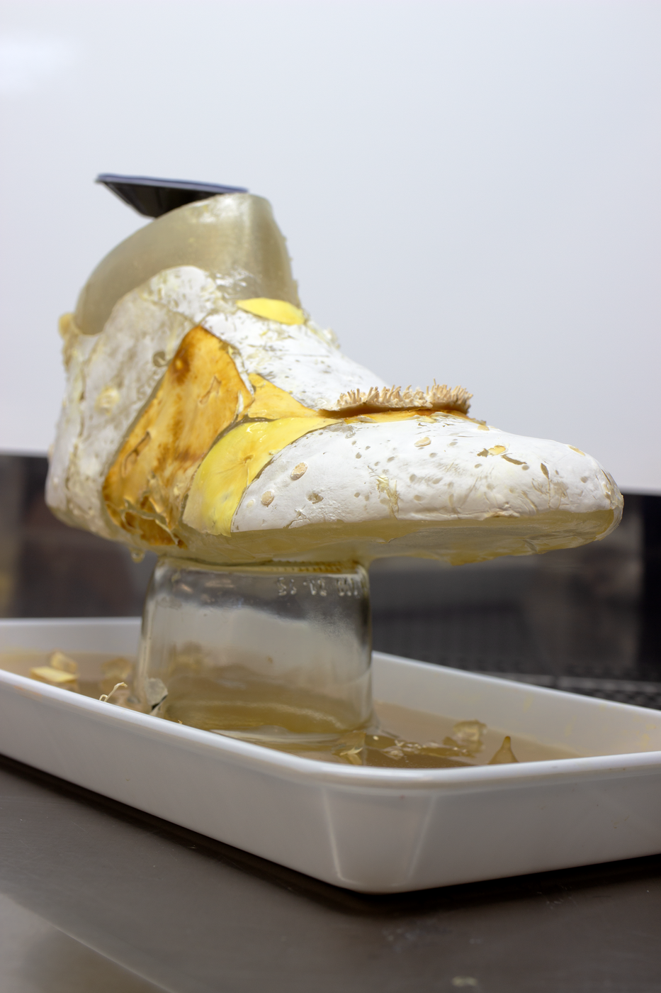 Wir begannen damit, auf eine dünne Schicht nährstoffangereicherten Hydrogels Stücke von Pilzmyzel aufzubringen. Das Myzel wuchs innerhalb kurzer Zeit über die gesamte Oberfläche des Schuhschafts und bildete so eine durchgehende, lebendige Materialschicht.