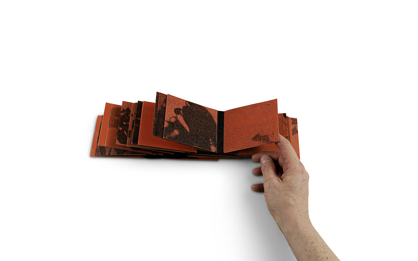 Zyklisch wie die Zeit, rau wie Sand und Gestein: Das Buchobjekt besteht aus aufeinander kaschierten Schleifpapierstücken unterschiedlicher Körnung. Sie sind mit wechselnden Abständen voneinander an einem innenliegenden Gewebeband befestigt. Anstatt eines Bundes finden wir eine leere Mitte, um die wir uns blätternd wie in einer Endlosschleife bewegen. Es ist kein Anfang und kein Ende auszumachen. Fast alle der Sandpapierseiten wurden mit Fotoemulsion behandelt – die verschiedenen  Körnungen und Belichtungszeiten lassen die so entwickelten amorphen Formen stets anders erscheinen. Werden diese Bilder irgendwann einmal – viel, viel später, vom Blättern abgetragen und zu Sedimenten geworden – wieder Teil eines größeren Kreislaufs sein?