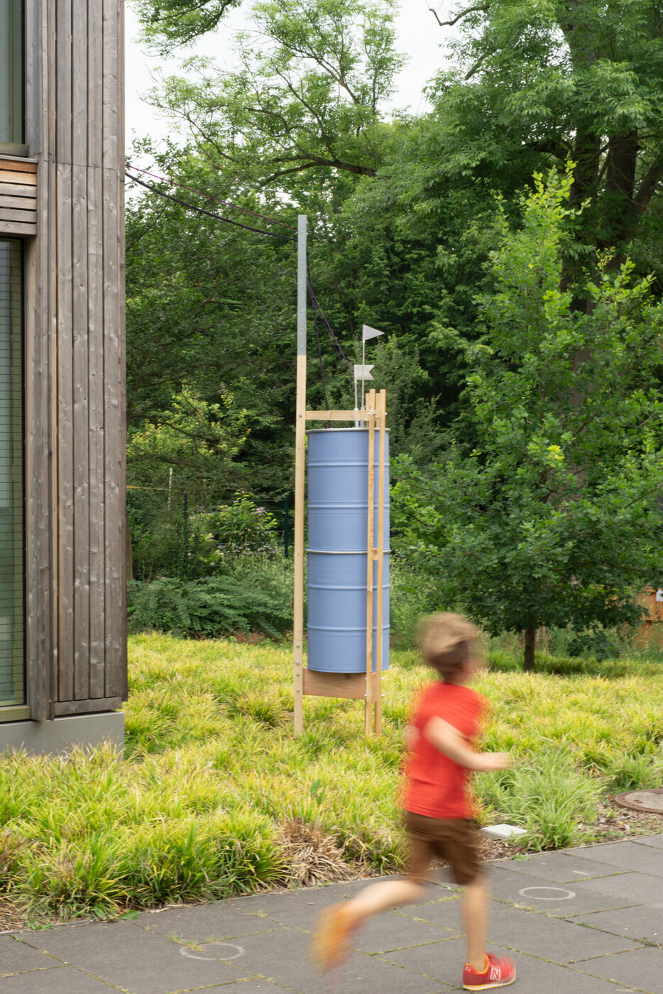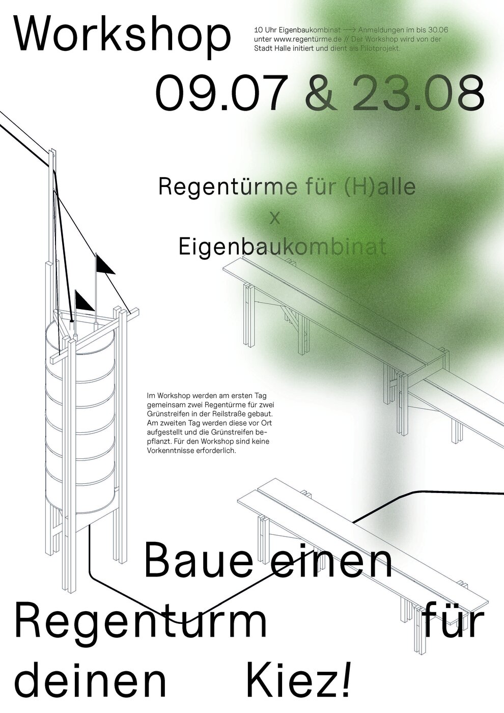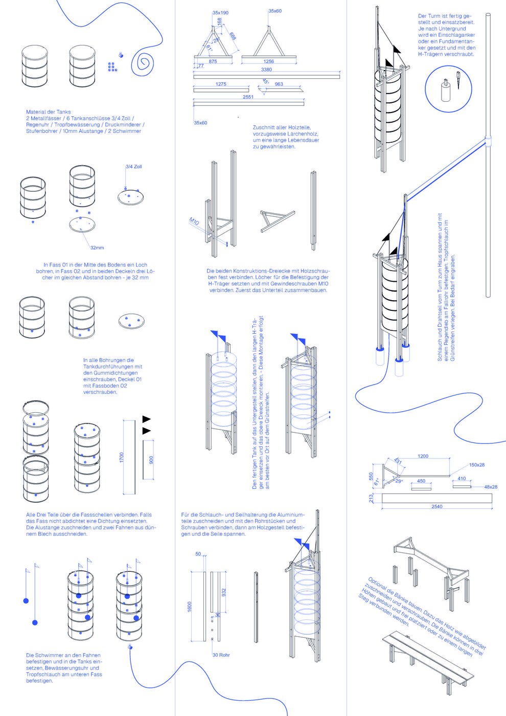 Regentürme ist ein Open-Source-Projekt: Alle Informationen und Anleitungen werden über eine Plattform zur Verfügung gestellt. Diese dient auch der Vernetzung und Öffentlichkeitsarbeit. In ersten Pilotprojekten werden die Prototypen getestet. Danach kann das Projekt über die Stadtgrenzen hinaus wachsen. Die Regentürme sammeln das Regenwasser von den Dachflächen, bevor es in die Kanalisation gelangt, und speichern es. Über eine gesteuerte Tröpfchenbewässerung wird das Wasser dann an Pflanzen und Bäume abgegeben. Zwei Fähnchen steigen und fallen mit dem Wasserstand und informieren die Passant*innen über den Wasserhaushalt ihrer Stadt.