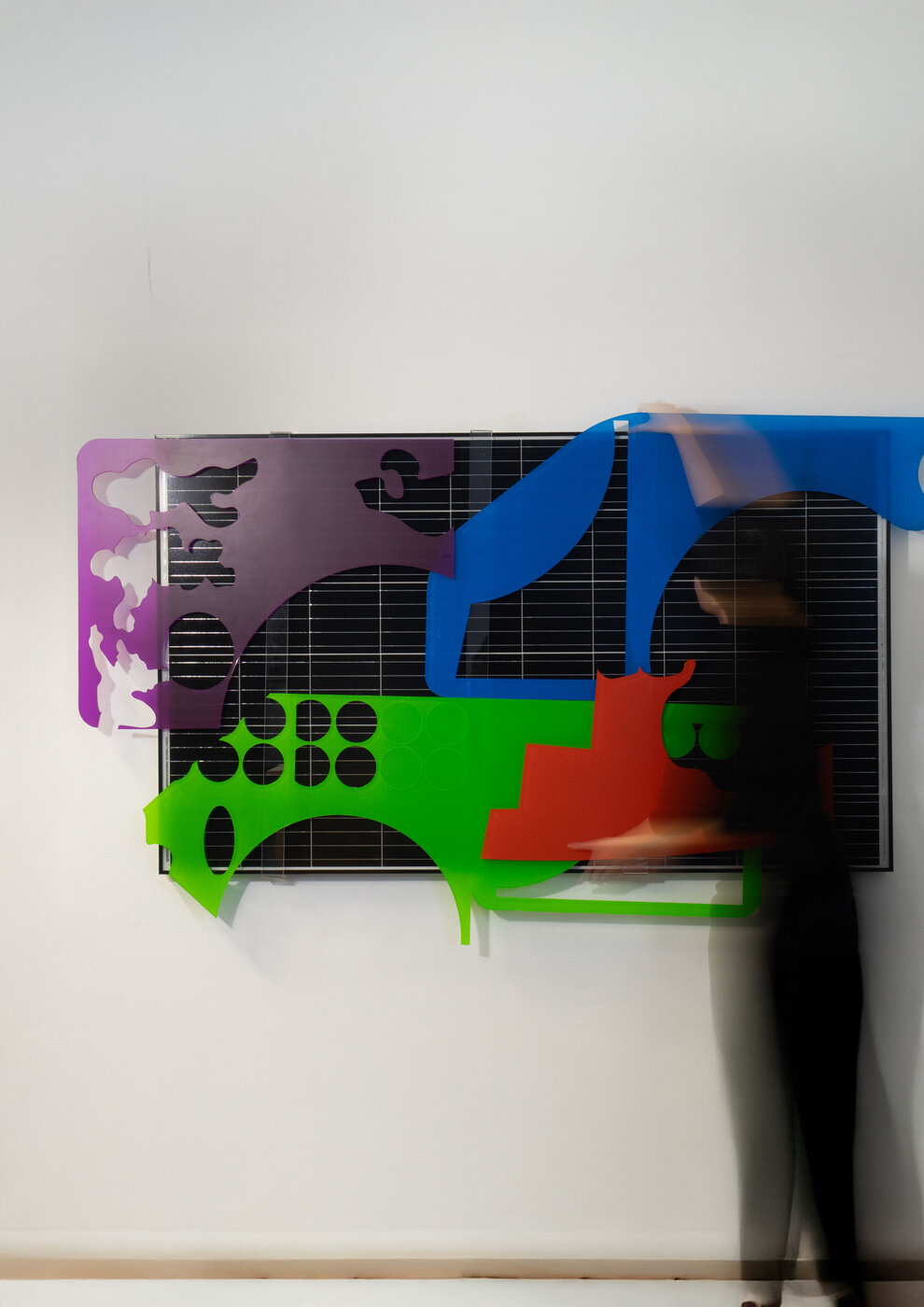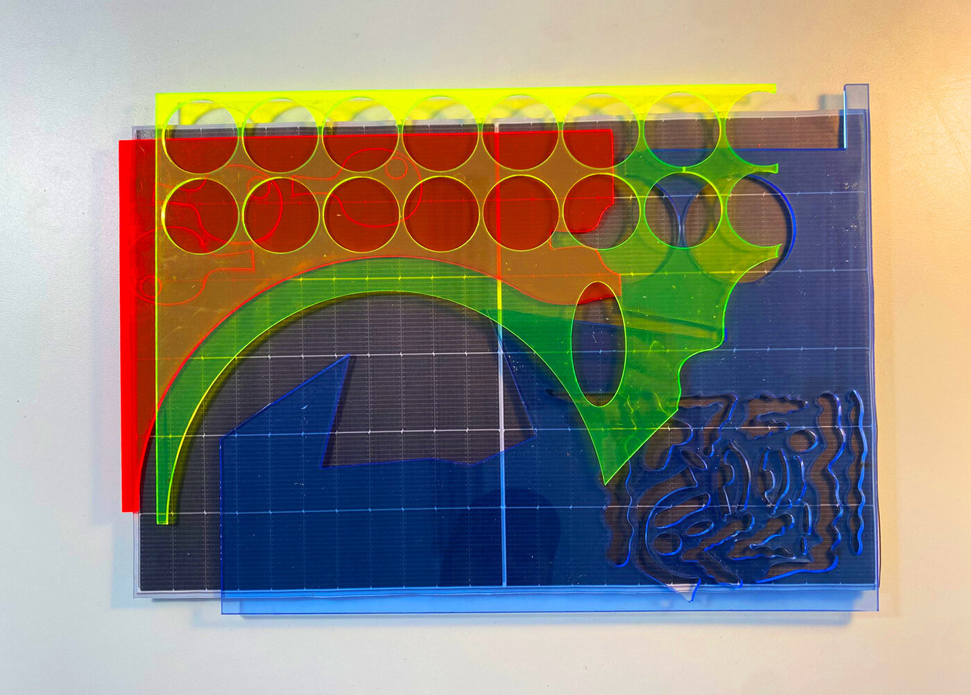 Im Zentrum stehen Solarmodule als funktionales Rückgrat. Davor wird eine vorgehängte Ebene aus recycelten Acrylplatten bzw. -fragmenten angebracht. Diese stammen aus industriellen Restmaterialien wie Verschnitt, Fehlformaten oder Produktionsüberschüssen aus Laserzuschnitt und Werbetechnik. Unterschiedliche Farben, Formen, Größen und Transparenzen bleiben bewusst sichtbar, nichts wird homogenisiert. Was ursprünglich thermisch verwertet wird, wird zum gestaltprägenden Element.