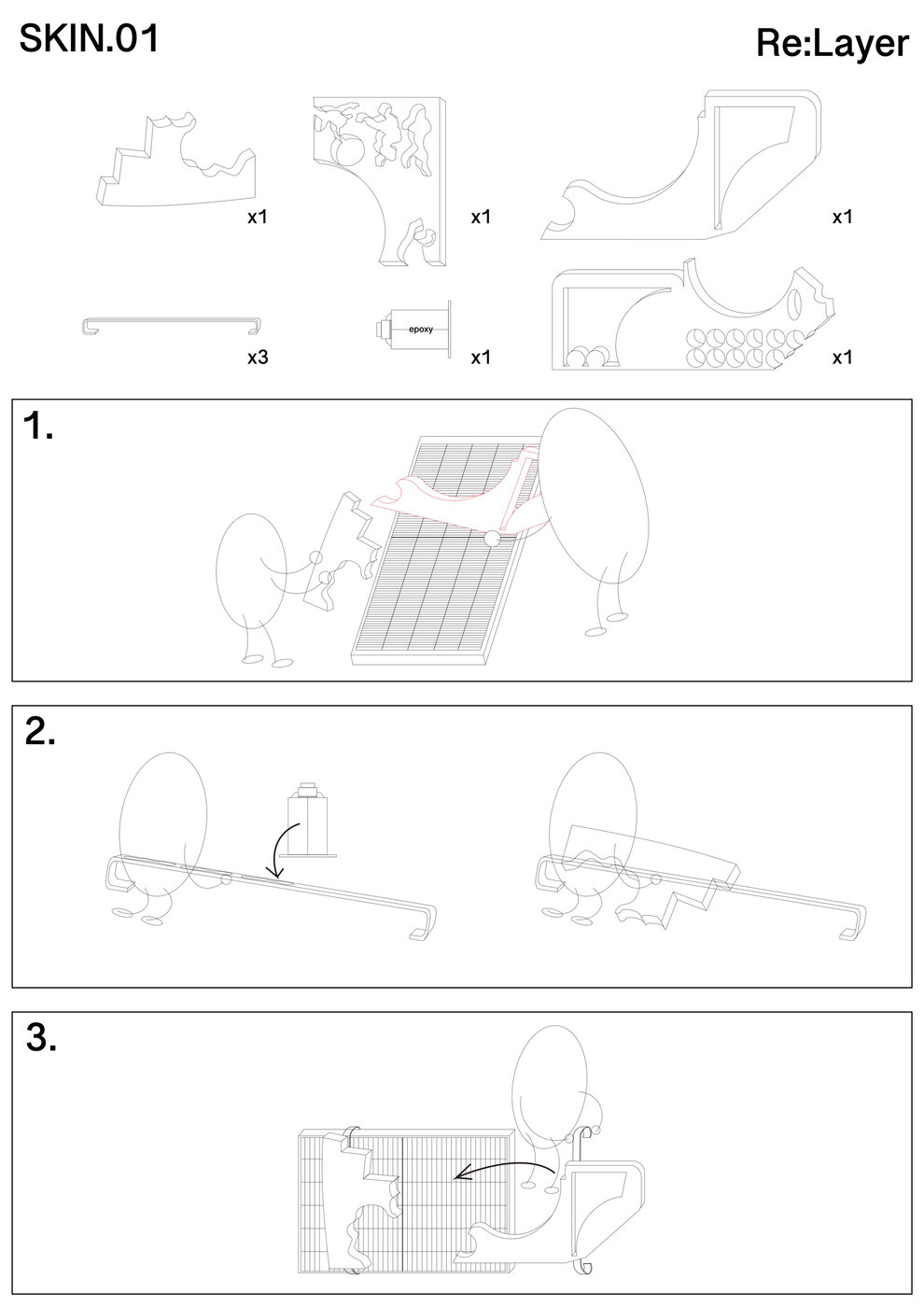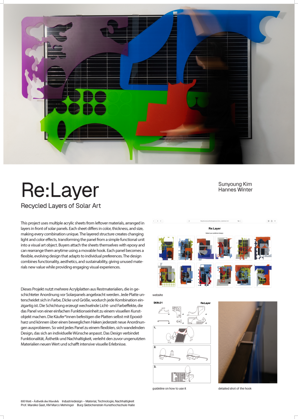 Re:LAYER versteht Photovoltaik nicht als notwendiges Übel, sondern als gestalterische Ressource. Das Projekt vereint Funktionalität, Nachhaltigkeit und Kunst zu einer neuen Fassadentypologie, in der Energieerzeugung und Materialbewusstsein räumlich, visuell und sinnlich erfahrbar werden. Jedes Panel wird so zu einem flexiblen, sich ständig verändernden System und einer harmonischen Verbindung von Umwelt und Design.