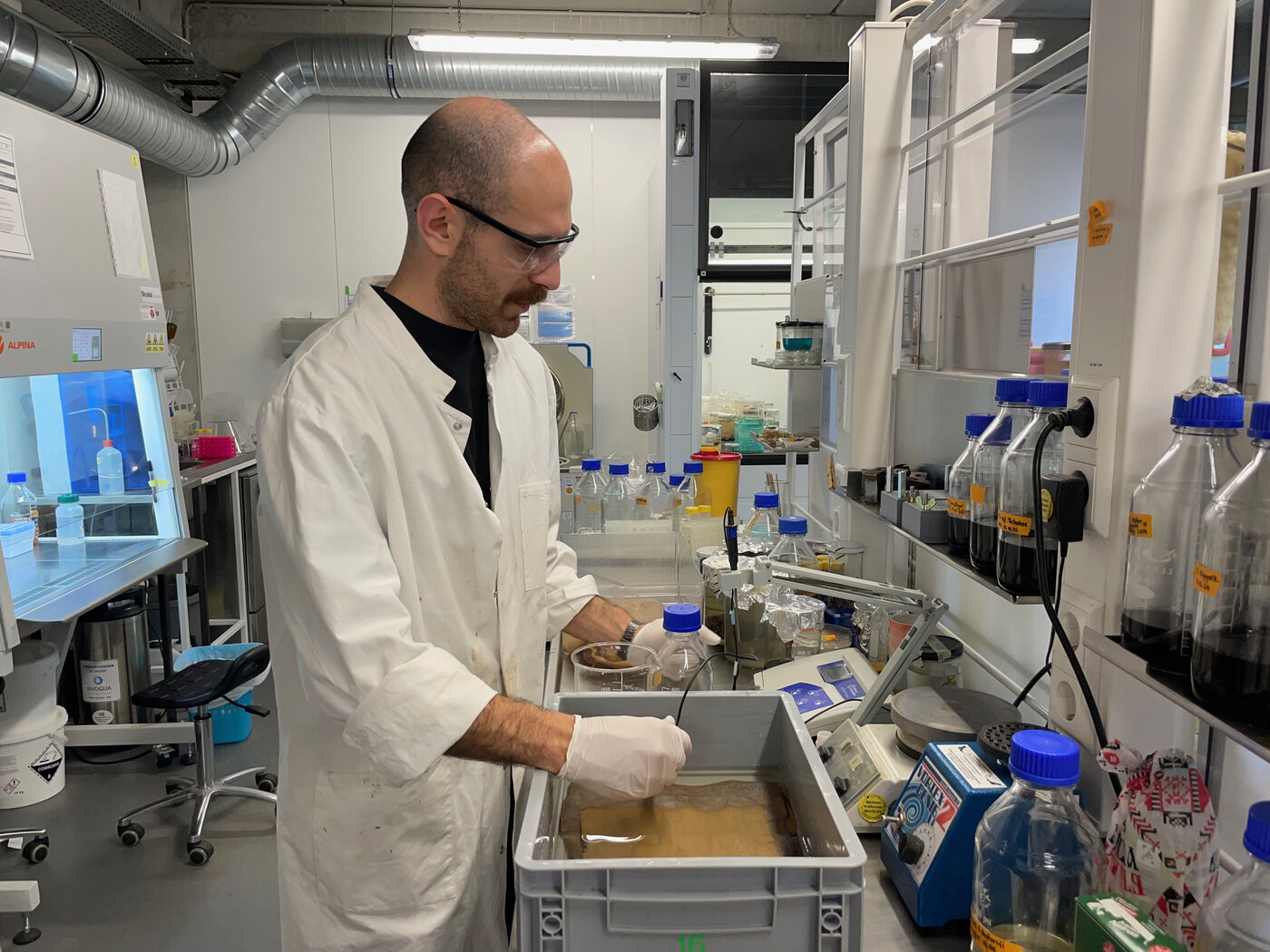 Das Projekt wurde von zwei Hauptzielen geleitet. Das erste Ziel bestand darin, ausreichende Mengen an bakterieller Zellulose zu kultivieren, um praktische Experimente und Materialuntersuchungen durchführen zu können. Dazu wurden Platten in Aquarium-Anlagen gezüchtet, die genügend Proben lieferten, um sie zu trocknen, zu schneiden und für grundlegende Tests und Prototypen vorzubereiten. Das zweite Ziel bestand darin, auf aktuelle Spitzenforschung zurückzugreifen, um zu ermitteln, wie bakterielle Zellulose als funktionales Textilmaterial weiterentwickelt werden könnte. Dazu gehörten ein PFAS-freies, plasma-basiertes wasserabweisendes Verfahren und bakterielle Selbstpigmentierung. Anstatt zu versuchen, diese wissenschaftlichen Erkenntnisse zu replizieren, konzentrierte sich dieser Schritt darauf,