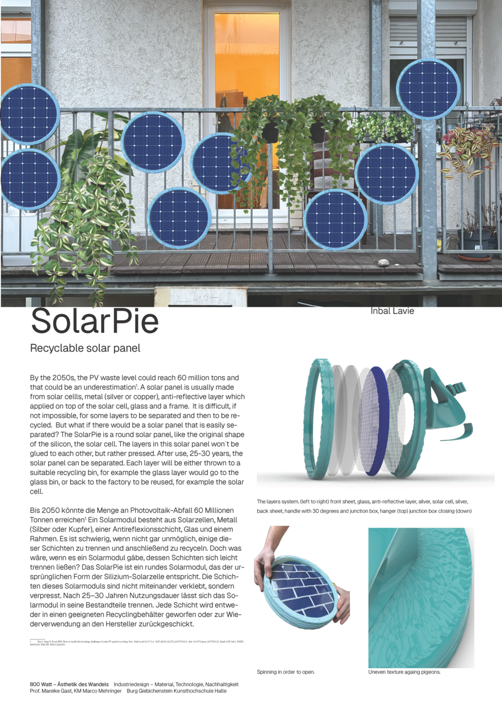 Insgesamt denkt SolarPie das Solarmodul neu – nicht nur als Energieerzeuger, sondern als Teil eines zirkulären Systems, das Langlebigkeit, Anpassungsfähigkeit, Recyclingfähigkeit und ökologische Verantwortung über den gesamten Lebenszyklus hinweg in den Vordergrund stellt.