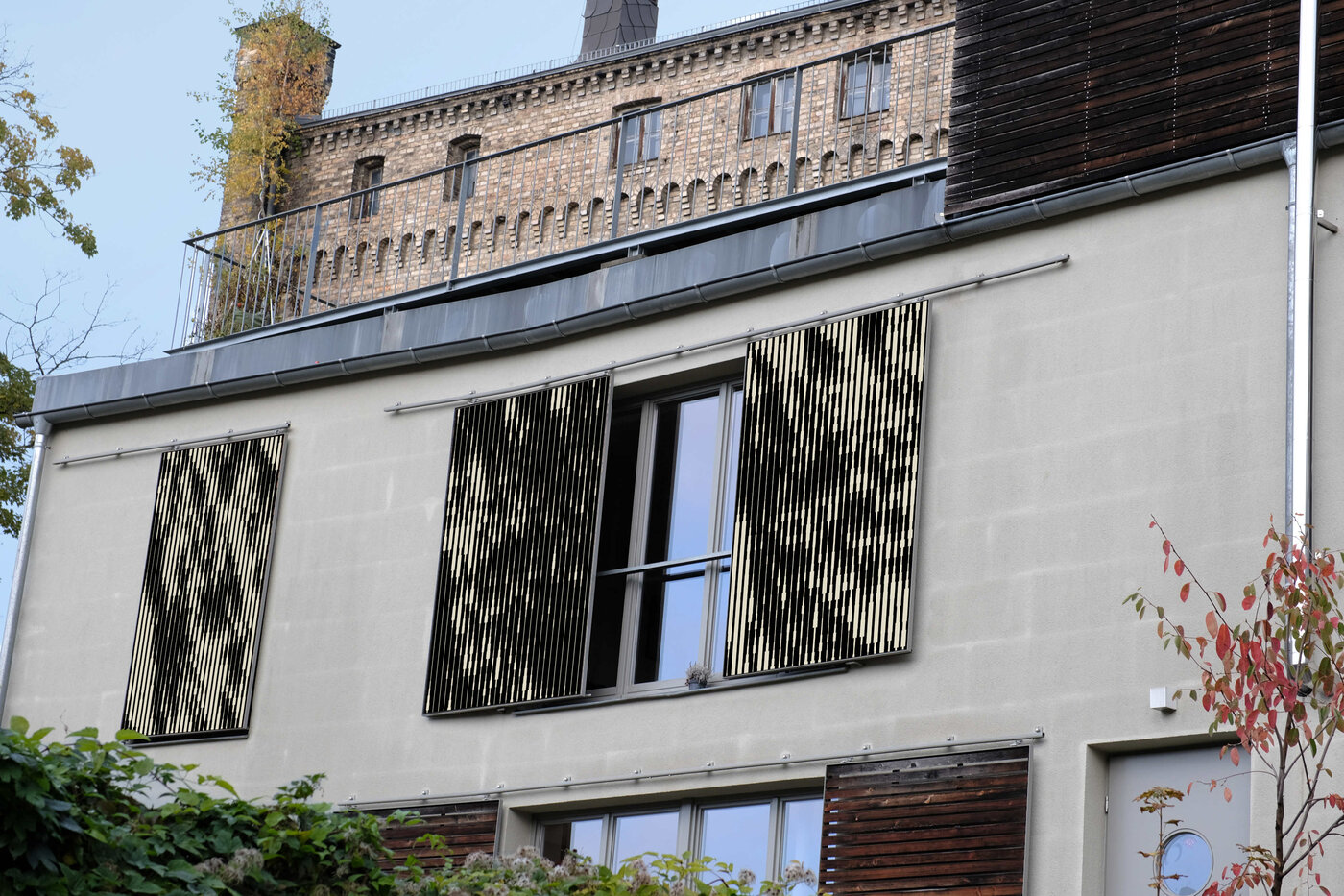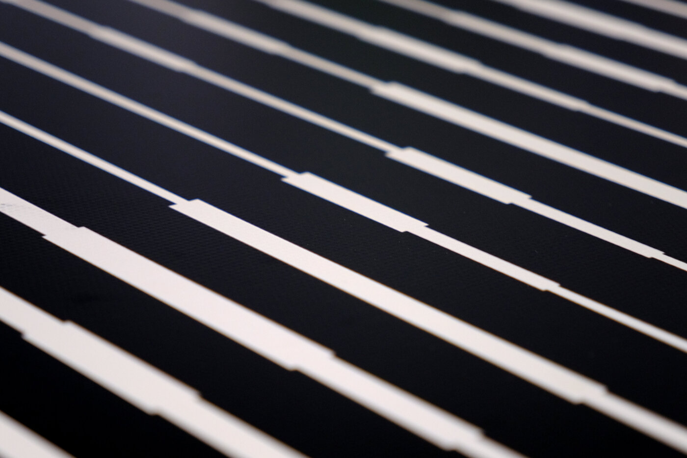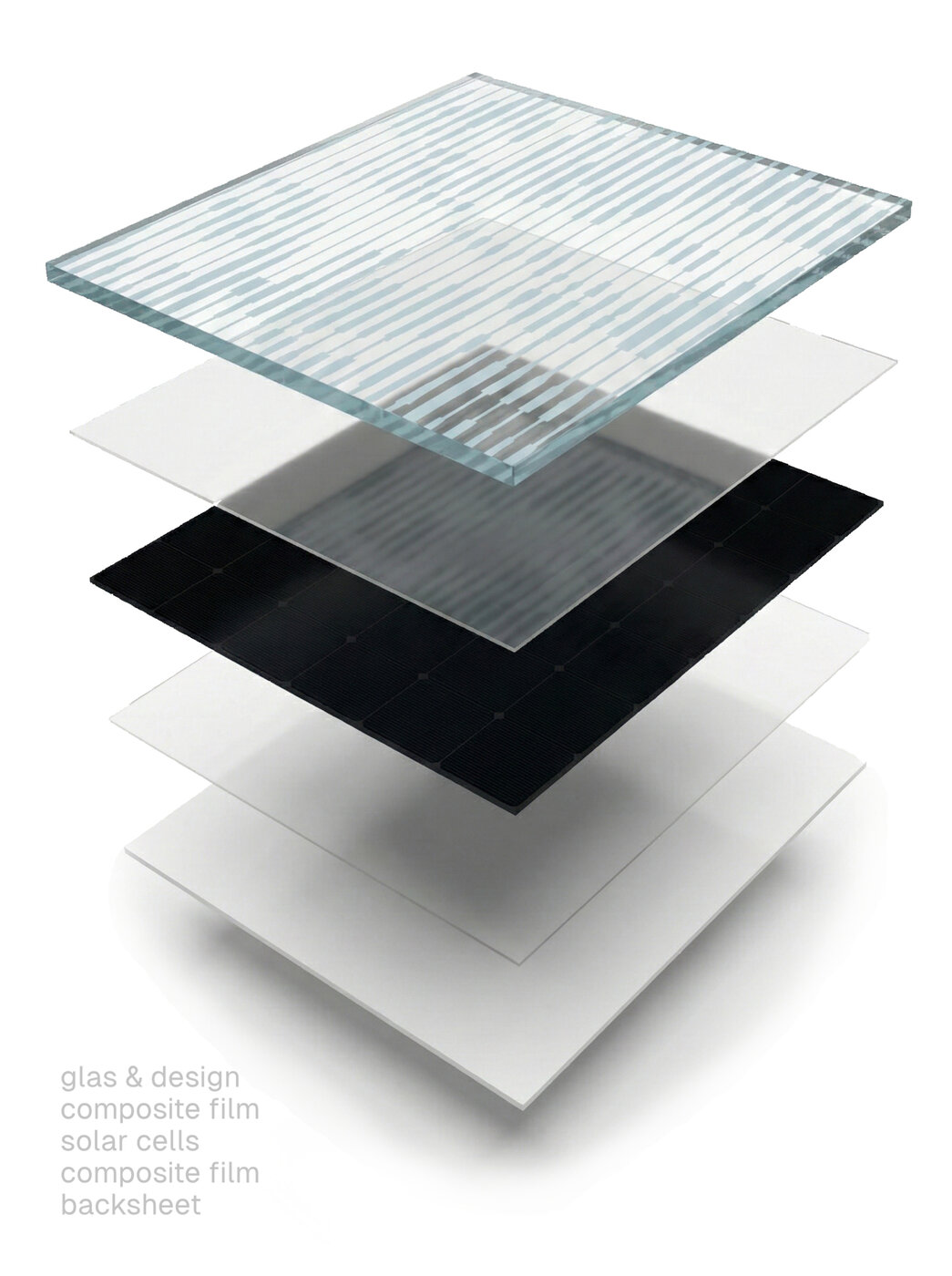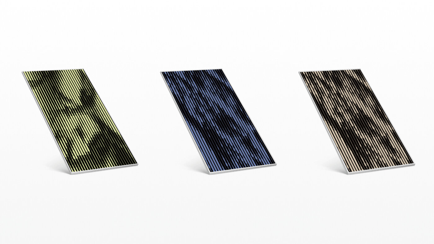 Dazu wird eine spezielle Farbbeschichtung auf das Modulglas aufgetragen. Ein Laser entfernt diese Schicht partiell und erzeugt so kontrastreiche Motive. Diese Beschichtungstechnologie beeinträchtigt die Energieausbeute nur minimal und gewährleistet einen Ertrag von 90-95 % im Vergleich zu unbeschichteten Modulen. Der Fokus liegt darauf, ein ausgewogenes Verhältnis zwischen moderner Abstraktion und funktionaler architektonischer Integration zu erreichen. Die Entwürfe verzichten bewusst auf eine zu plakative Bildhaftigkeit und bewahren stattdessen eine reduzierte, technische Ästhetik. Ein kuratierter und stetig erweiterter Katalog bietet dabei vielfältige Musteroptionen, um flexibel auf unterschiedlichste architektonische Kontexte zu reagieren. Durch die parametrische Umsetzung der Bilddateien können spezifische Variablen wie Linienstärke, Frequenz sowie horizontale und vertikale Abstände flexibel angepasst werden. Das Spielen mit Parametern zeigt den Einfluss von Farbe und Strichstärke auf die Wahrnehmung des Moduls. Während Muster aus der Nähe betrachtet rein grafisch und statisch wirken, transformieren sie sich mit zunehmender Distanz in fluide, wellenartige Strukturen. Es entsteht eine einheitliche „visuelle DNA“, die skalierbar und an verschiedene Modulgrößen anpassbar bleibt, ohne ihre detailreiche, kontrastreiche Qualität zu verlieren.